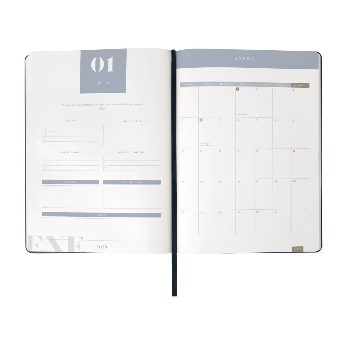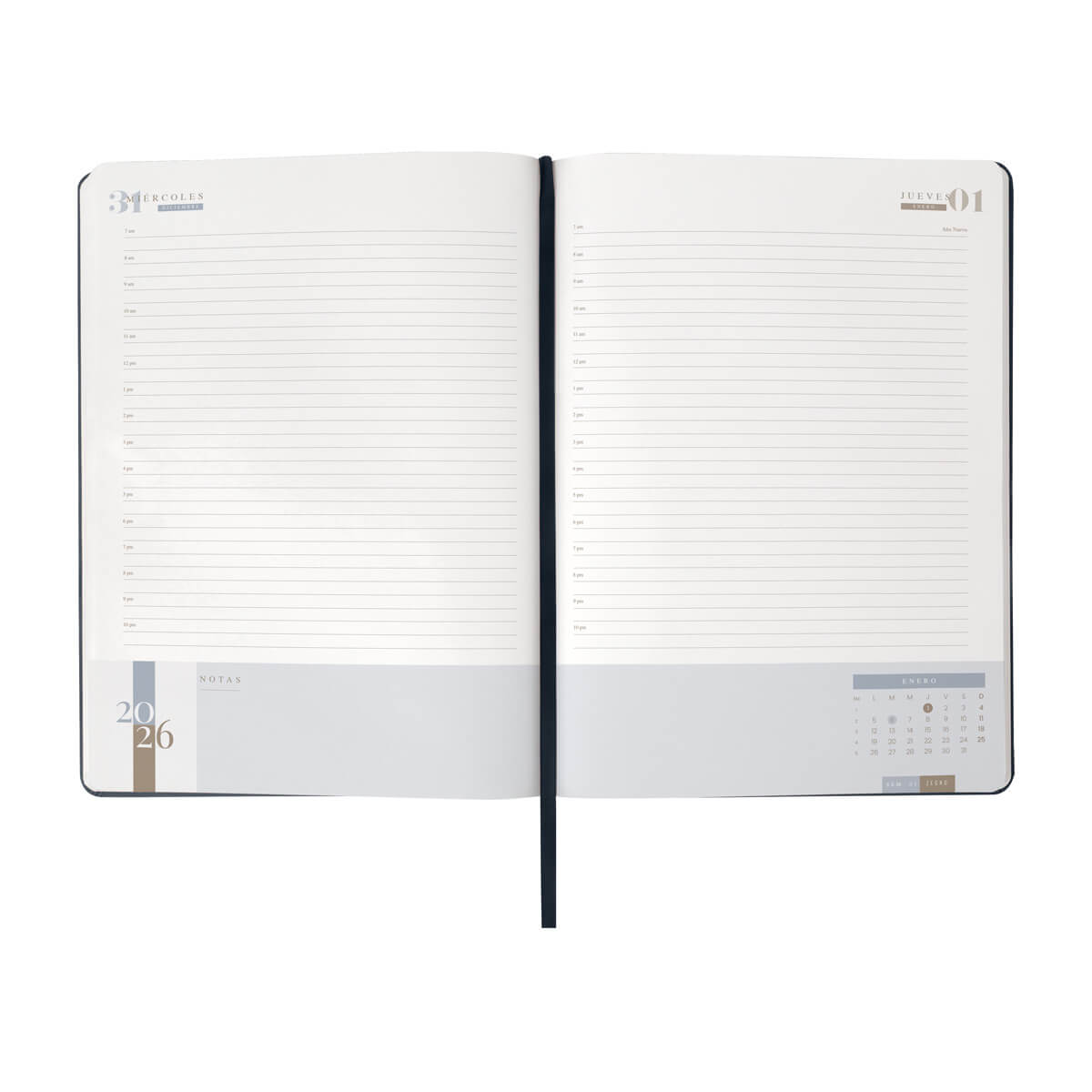 Agenda diaria con 174 hojas. Contiene datos personales, calendarios 2025-2026-2027, planeador 2026, seguimiento de nuevos hábitos y días festivos. Incluye caja individual. – AGDU 026