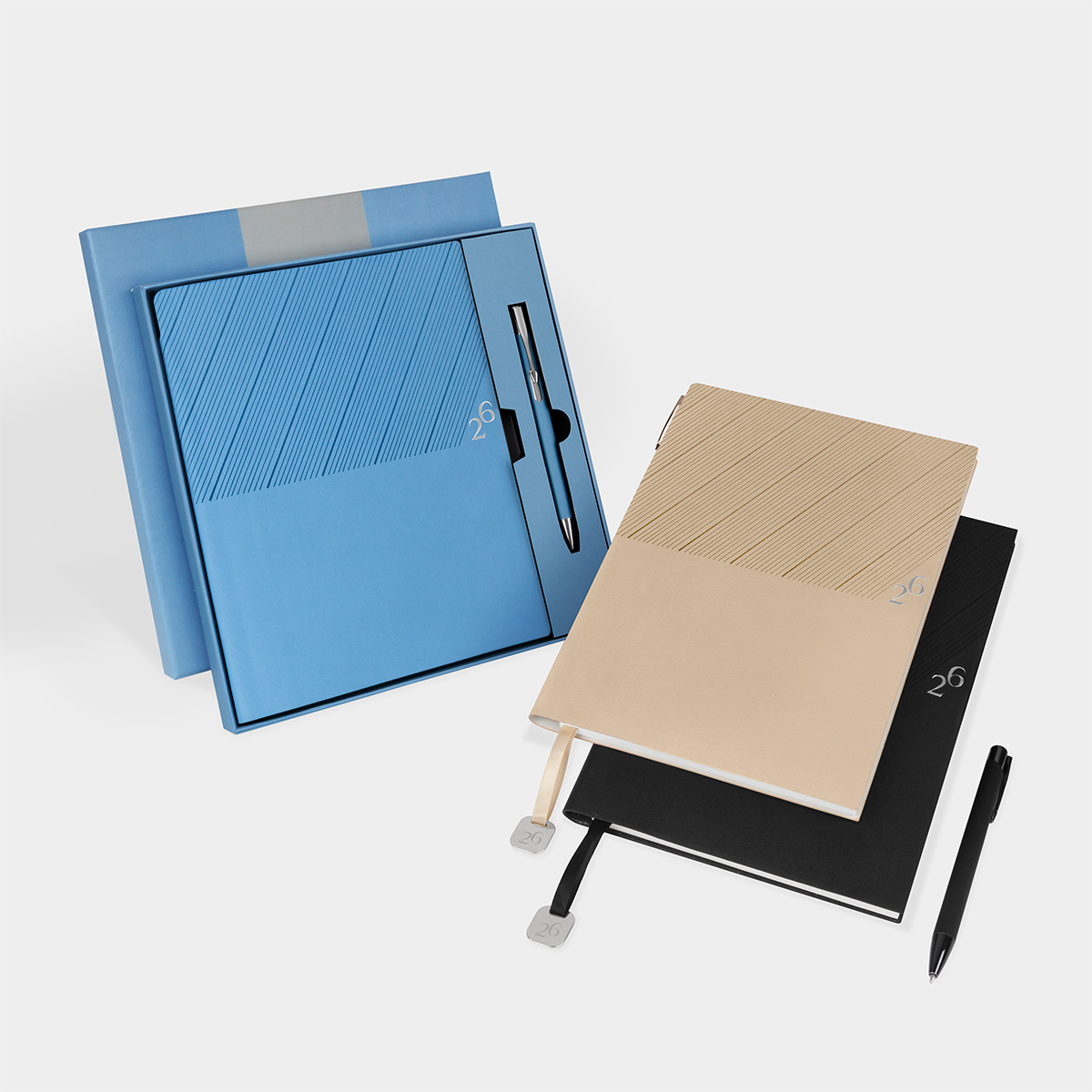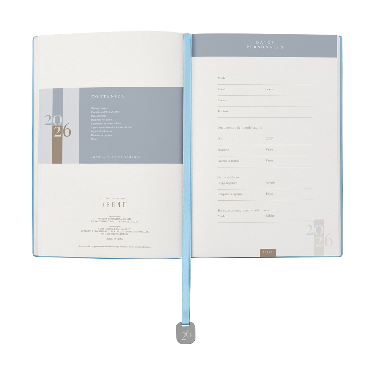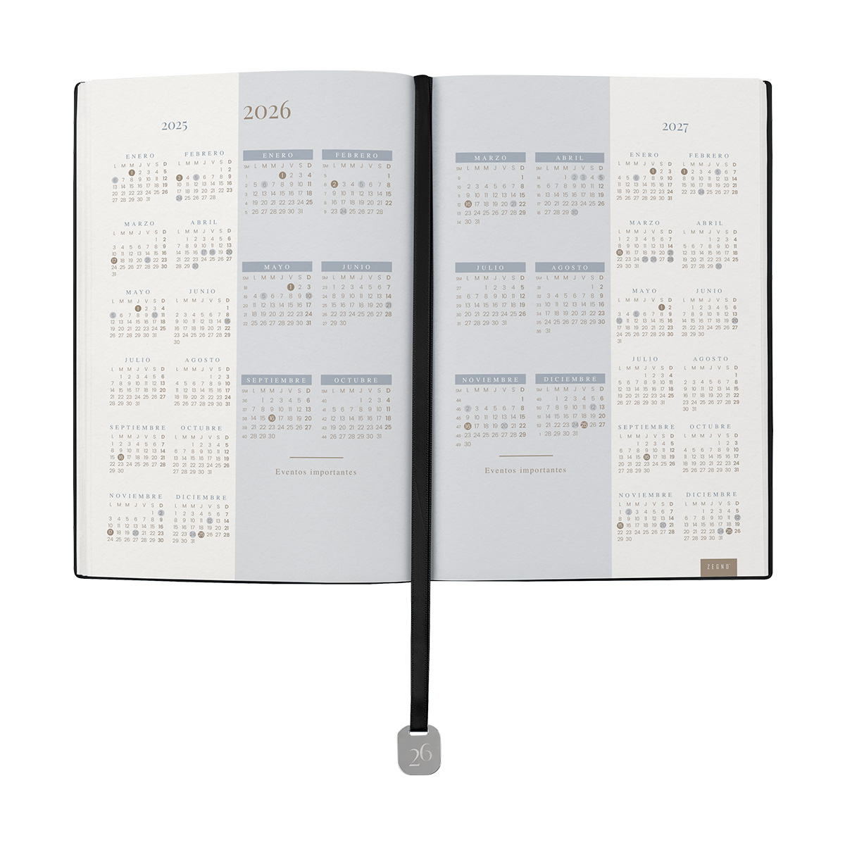 Agenda semanal con 100 hojas. Contiene datos personales, calendarios 2025-2026-2027, planeador 2026, presupuesto de gastos, seguimiento de nuevos hábitos, organizador de tareas, planeador de proyectos y días festivos. Incluye caja individual del mismo color a la agenda, separador con placa metálica y bolígrafo. – AGCS 026