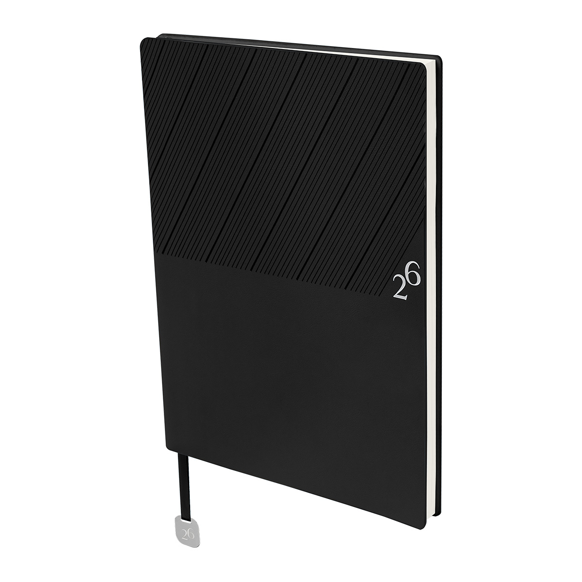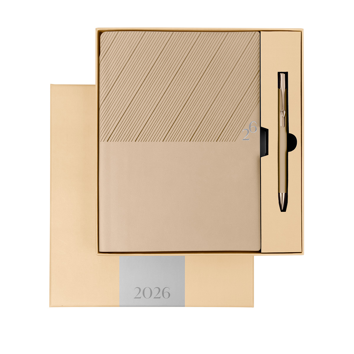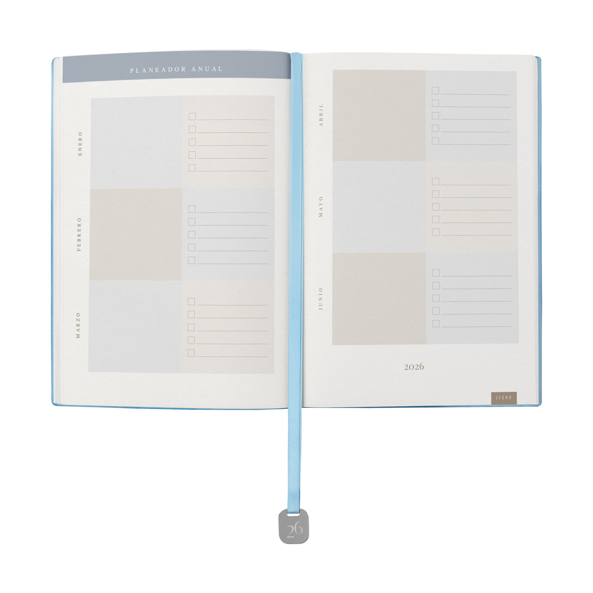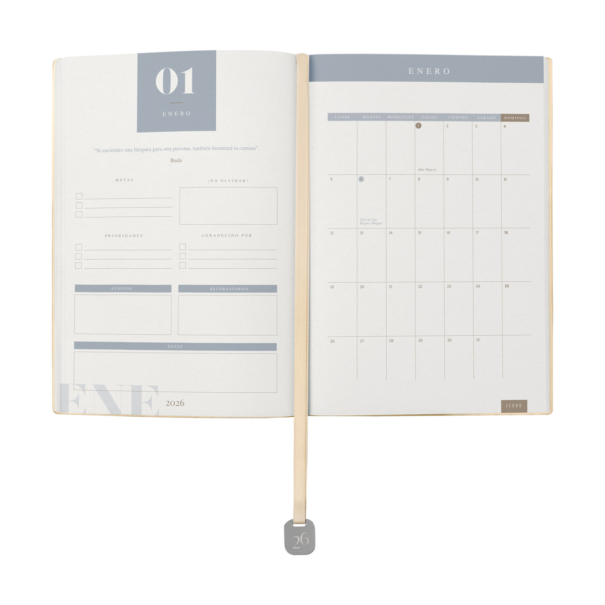 Agenda semanal con 100 hojas. Contiene datos personales, calendarios 2025-2026-2027, planeador 2026, presupuesto de gastos, seguimiento de nuevos hábitos, organizador de tareas, planeador de proyectos y días festivos. Incluye caja individual del mismo color a la agenda, separador con placa metálica y bolígrafo. – AGCS 026