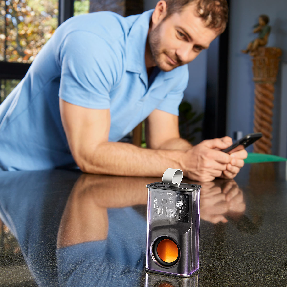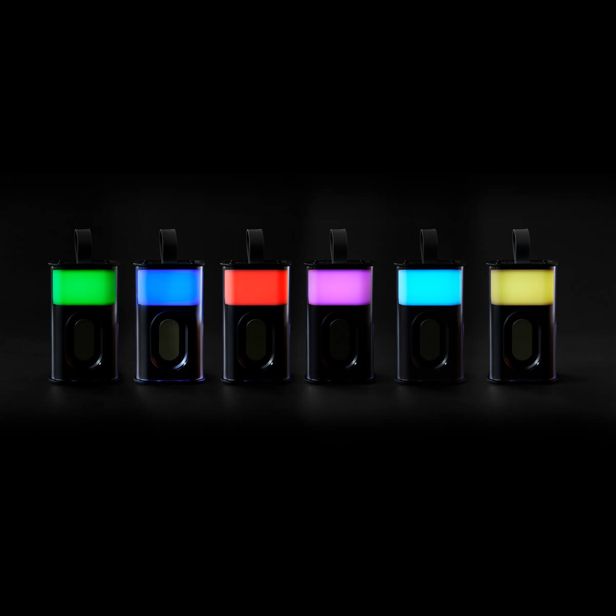 Bocina bluetooth recargable. Luz RGB con 7 efectos diferentes. Reproducción de música por 3 horas aproximadamente. Tiempo de carga 2-3 horas. Alcance de conexión de 10 metros. Batería de 500 mAh. Conexión tipo C. Incluye cable auxiliar y asa de silicón para transportarla fácilmente. – Z 018