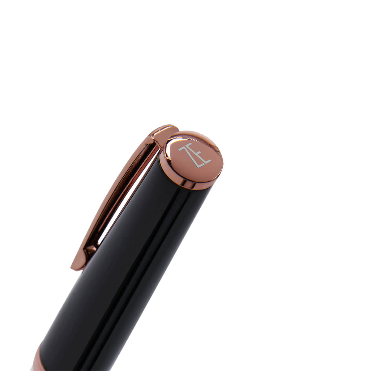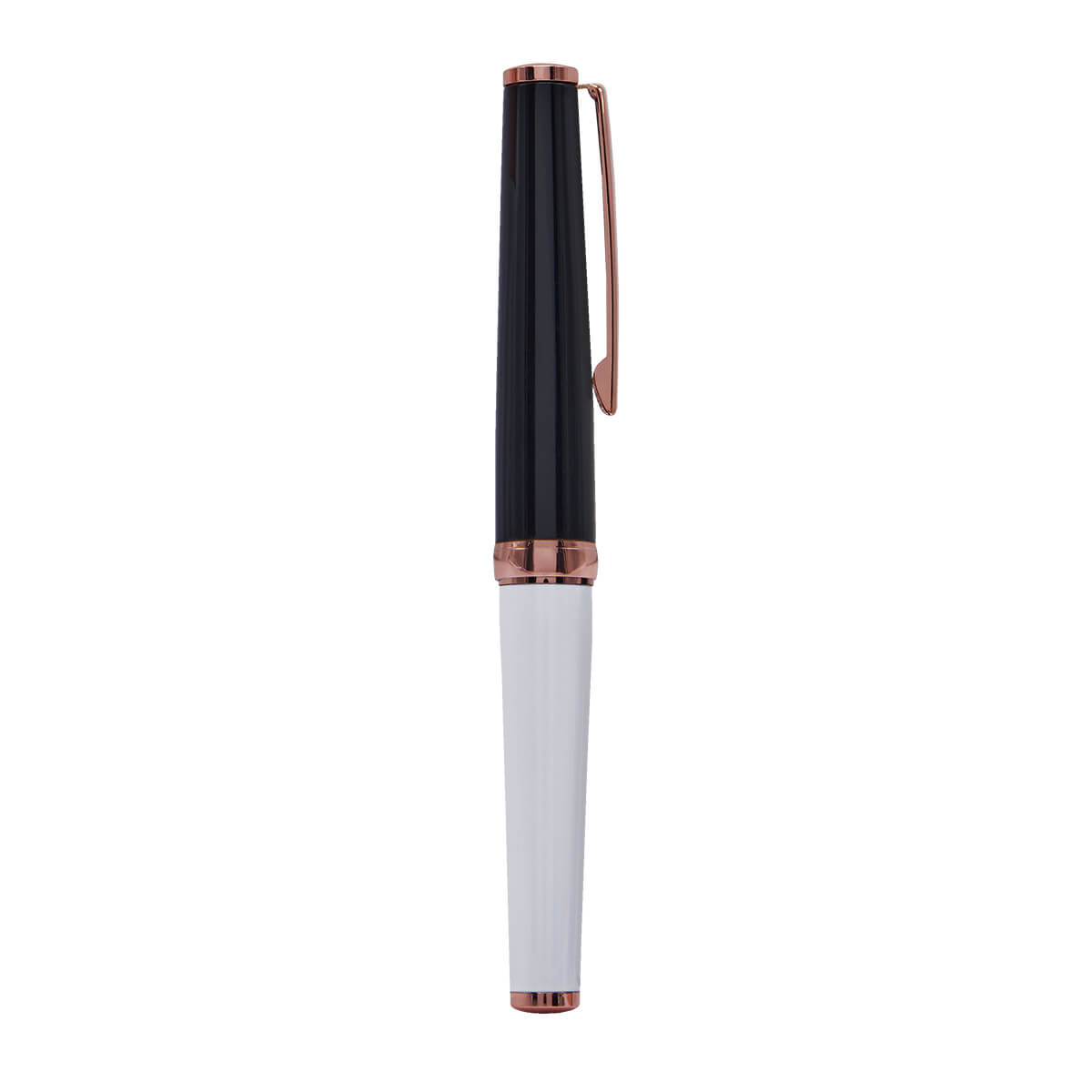 Bolígrafo metálico con tapón. Cuerpo en color blanco con punta dorada. Tapón en color negro y clip dorado. Incluye funda. – RQ 1050