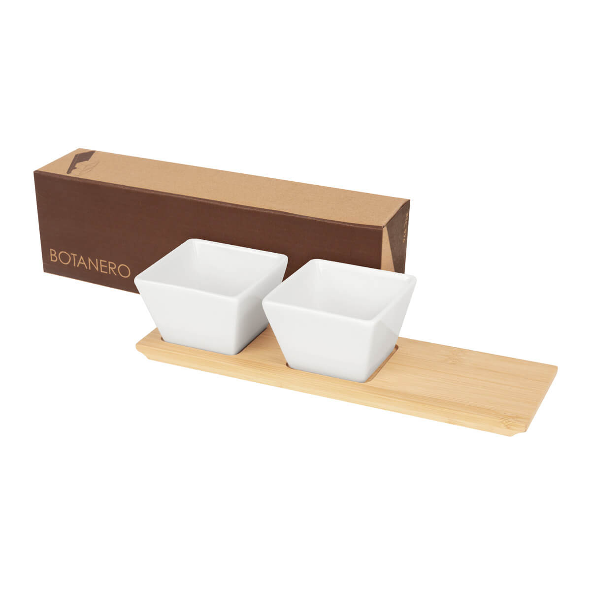 Botanero con base de bambú y dos contenedores de cerámica. Perfectos para servir botanas, dips o salsas con estilo. Ideal para reuniones, cenas o cualquier ocasión donde el diseño y la practicidad se encuentren. Incluye caja individual. El bambú es un producto natural el cual puede presentar variaciones en tonalidades y vetas. – KTC 976