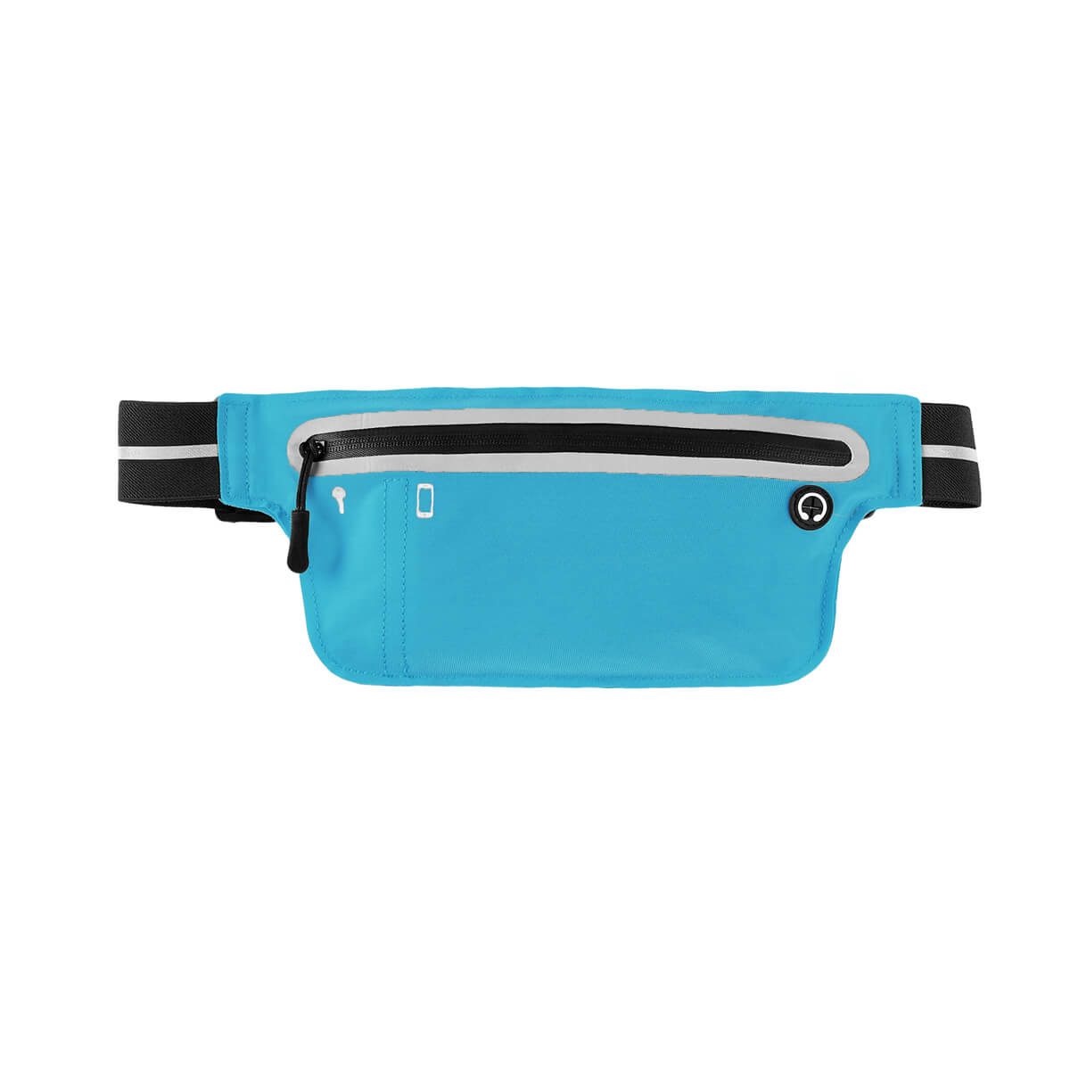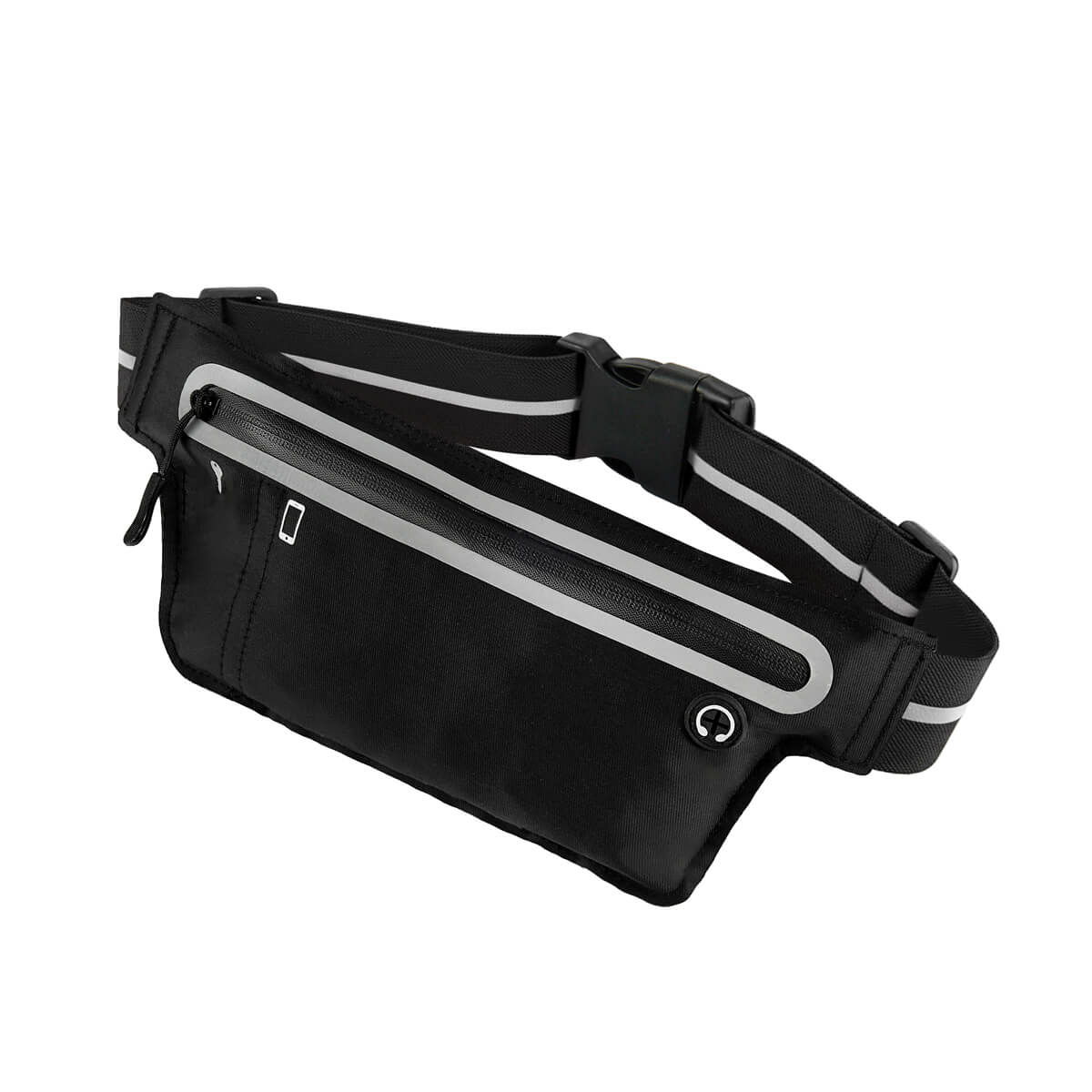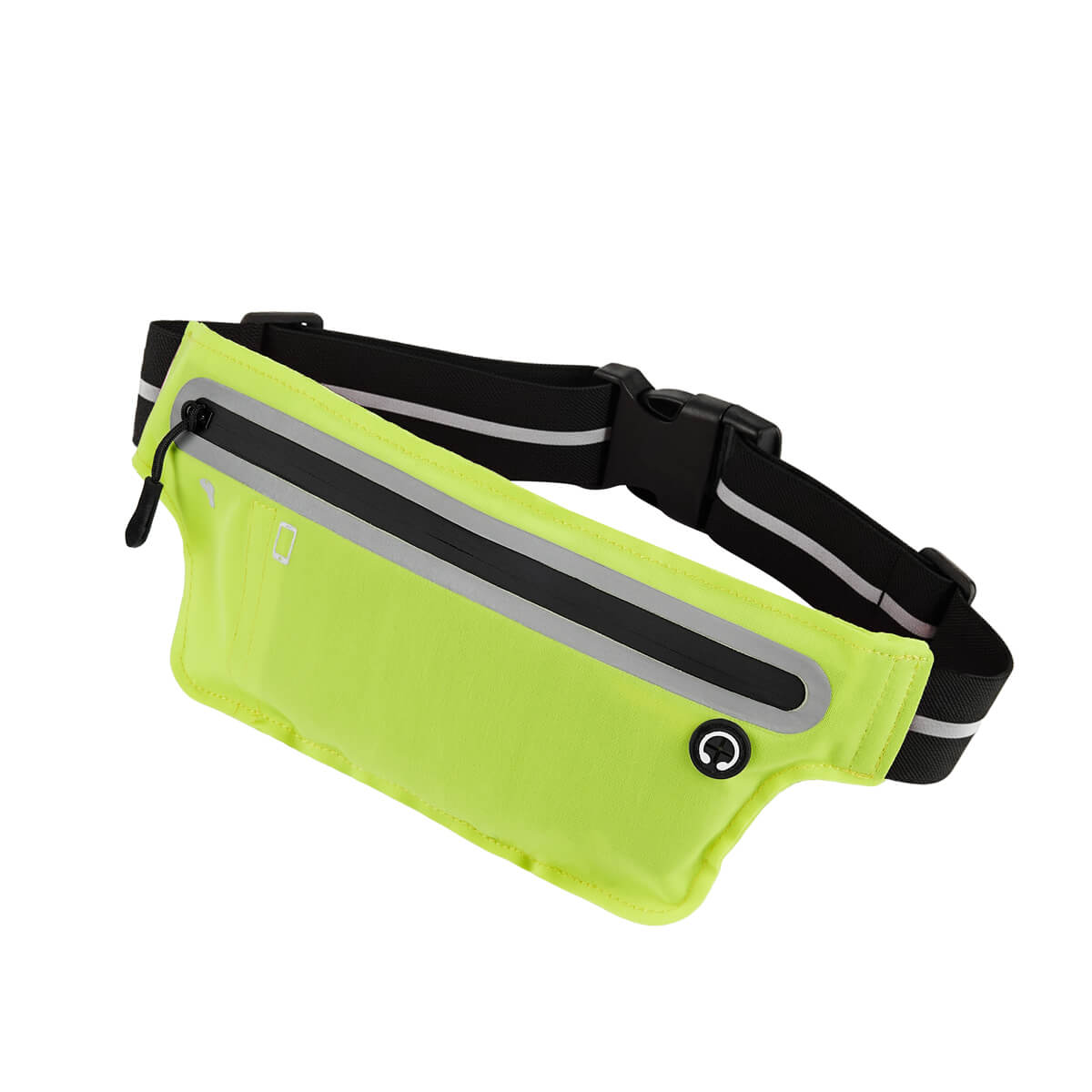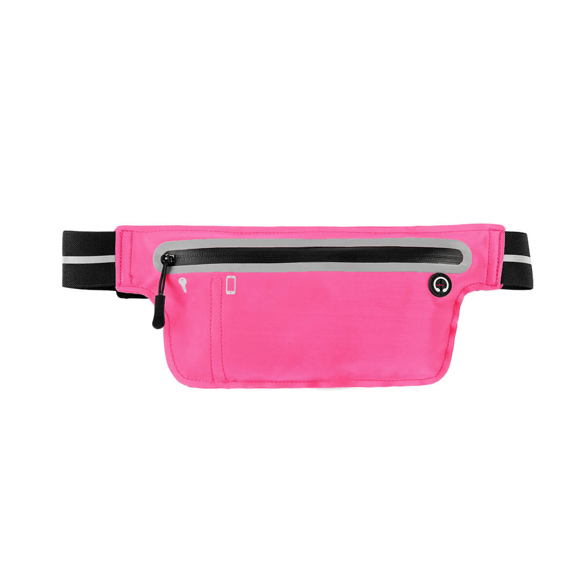 Cangurera deportiva ligera. Incluye interior plastificado. Ofrece resistencia al agua y comodidad en todo momento. Su compartimento con cierre y puller con correa permite guardar lo esencial, mientras que la salida para audífonos con cable te acompaña con música en cada paso. La banda elástica con broche de plástico se adapta fácilmente al cuerpo, y sus detalles reflejantes en cinturón y cuerpo brindan visibilidad extra en condiciones de poca luz. – SPO 023