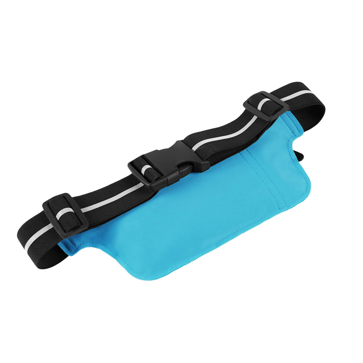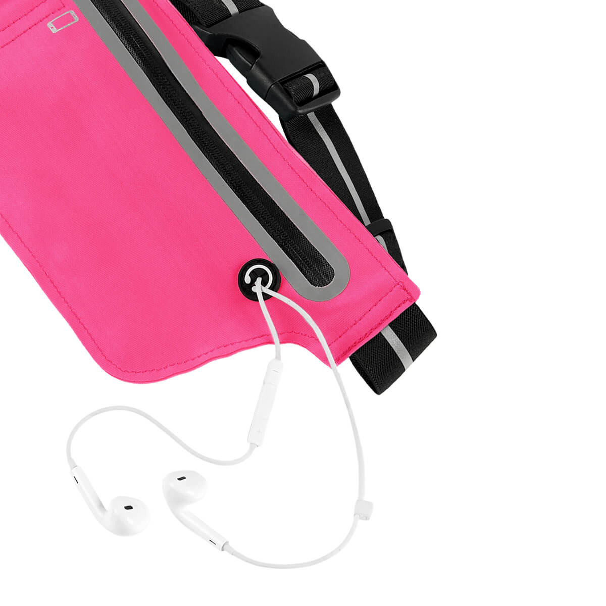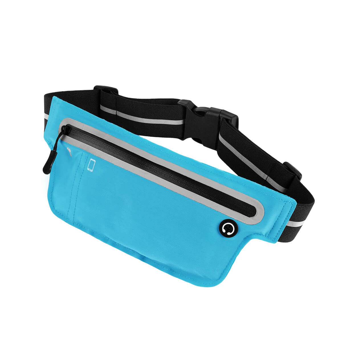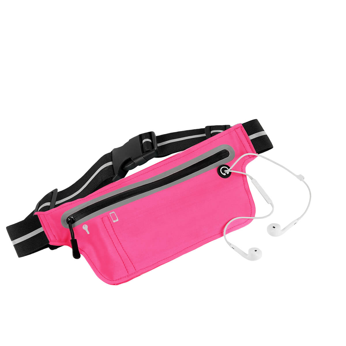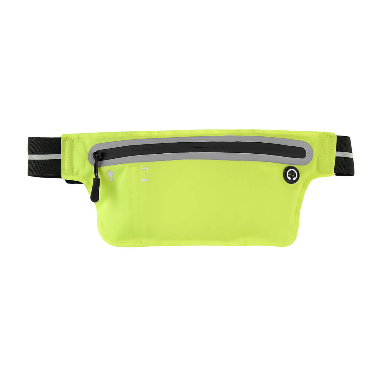 Cangurera deportiva ligera. Incluye interior plastificado. Ofrece resistencia al agua y comodidad en todo momento. Su compartimento con cierre y puller con correa permite guardar lo esencial, mientras que la salida para audífonos con cable te acompaña con música en cada paso. La banda elástica con broche de plástico se adapta fácilmente al cuerpo, y sus detalles reflejantes en cinturón y cuerpo brindan visibilidad extra en condiciones de poca luz. – SPO 023