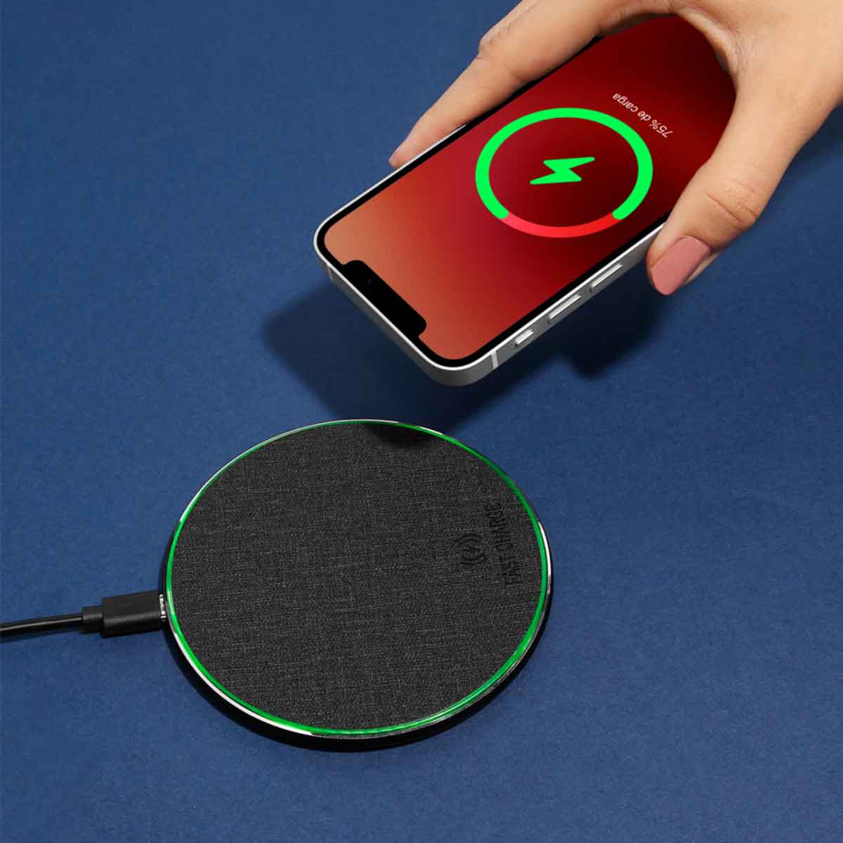 Cargador inalámbrico «fast charge». Velocidad de carga: 5W / 7.5W / 10W / 15W. Se enciende luz color verde cuando está en reposo y luz color azul cuando está en proceso de carga. Incluye cable auxiliar tipo C y caja individual. – CRG 052