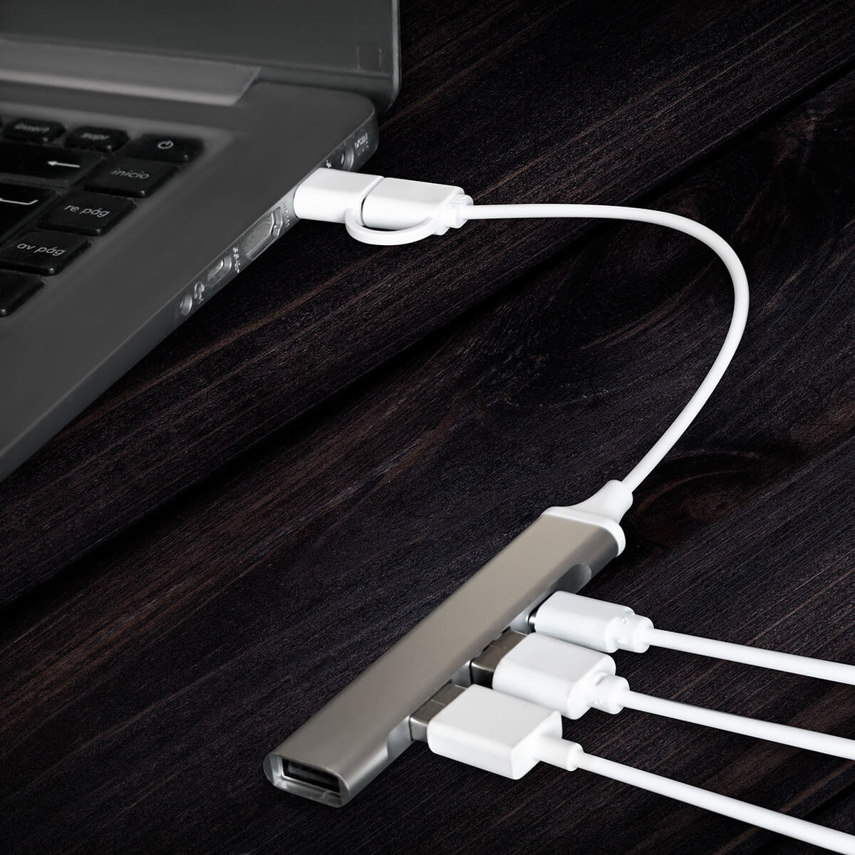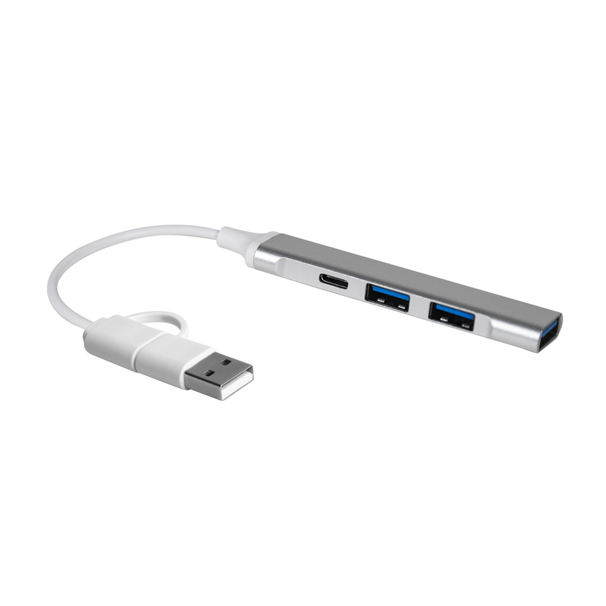 Concentrador acabado metálico con 3 puertos USB y 1 puerto tipo C. Soporta transferencia de datos. Cable de conexión con USB y tipo C. – HUB 013