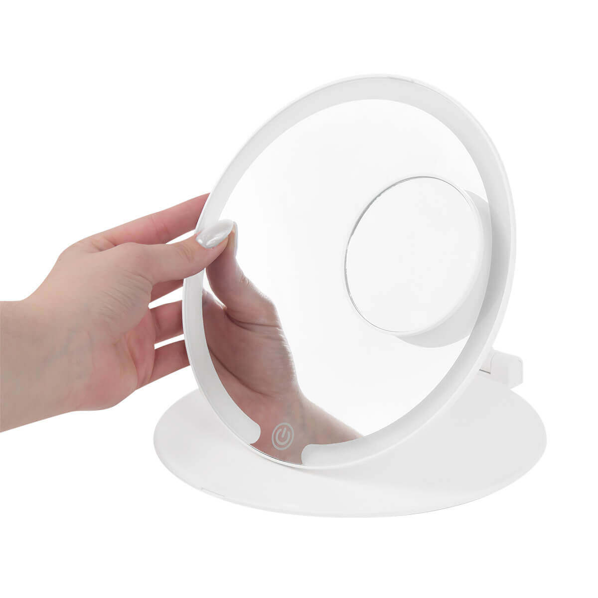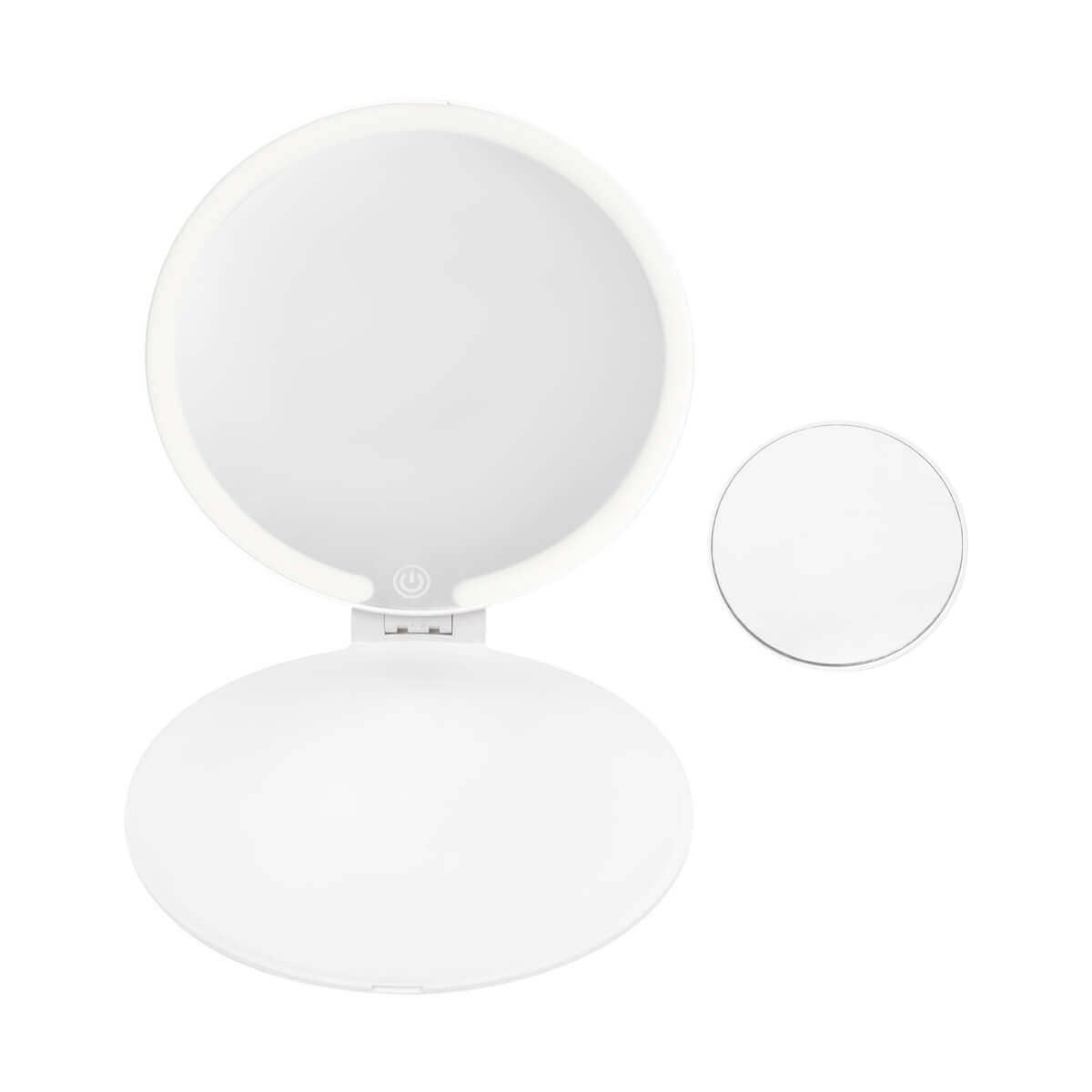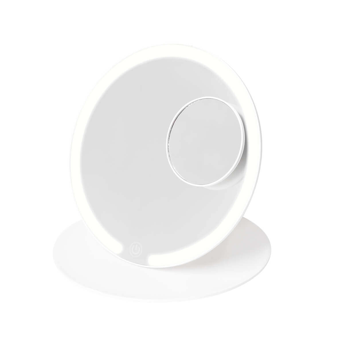 Espejo plegable con iluminación LED con 3 modos de luz: fría, natural y cálida. Pulsando el botón del sensor táctil one touch. Duración de luz de 3.5 hrs. Incluye espejo magnético de aumento 5x, puerto de carga y cable tipo C. – DAM 077
