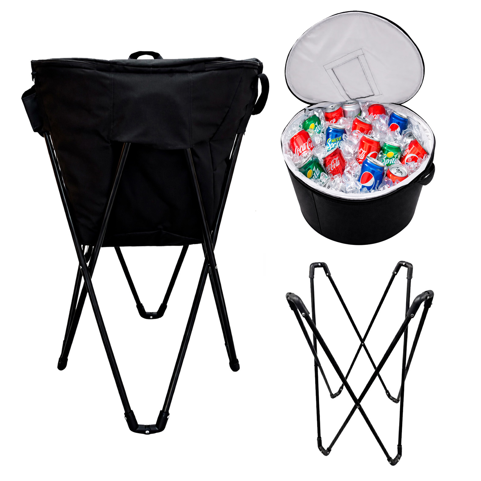 Hielera con interior impermeable, cierre y ventana con velcro para fácil acceso en la parte superior, asas y soporte de metal plegable. – 4P-LON 070