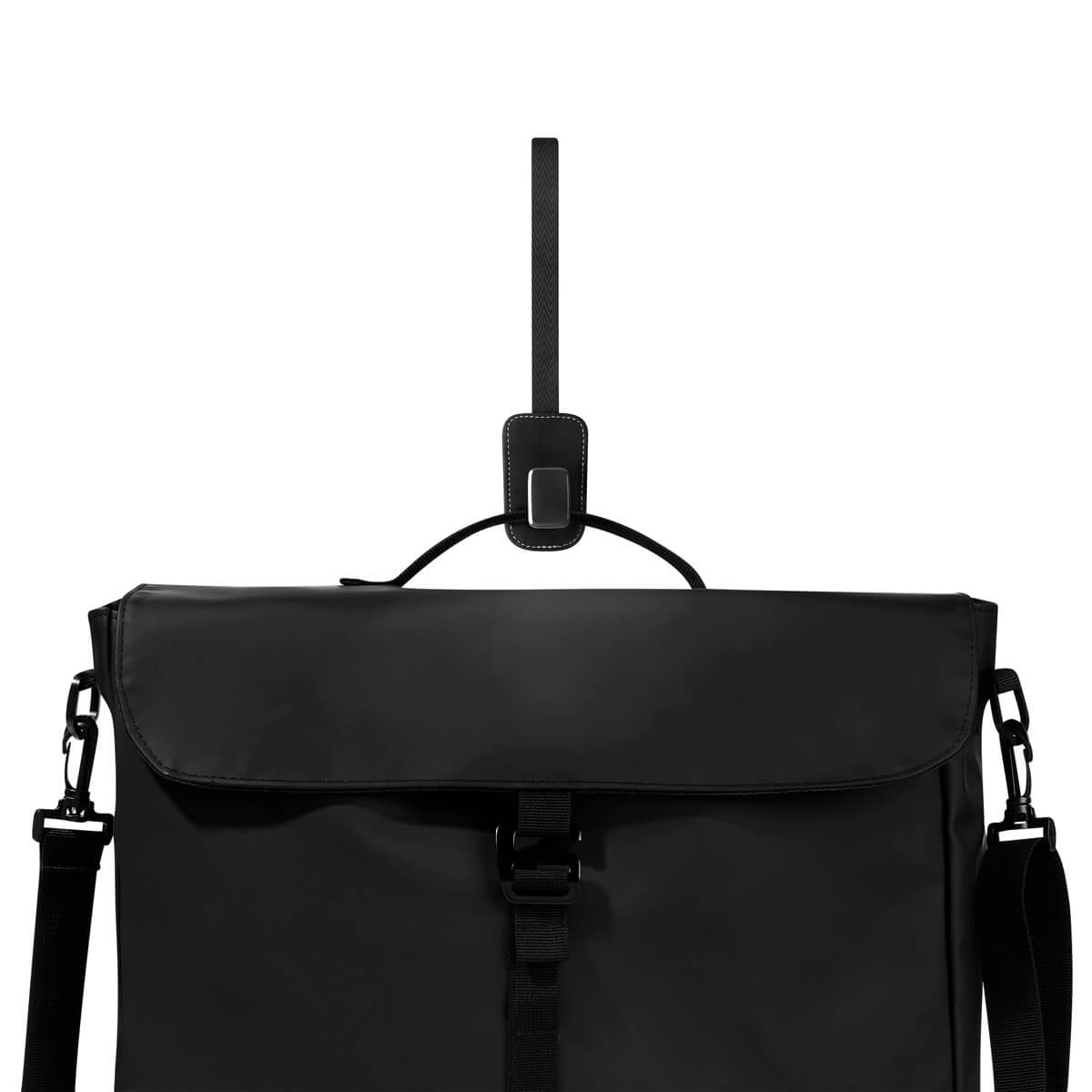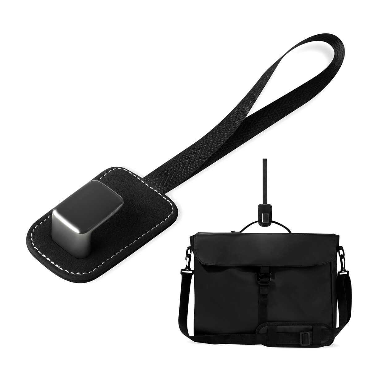 Gancho de metal perfecto para colgar bolsas, mochilas o accesorios. Su asa de poliéster permite montarlo y desmontarlo fácilmente, adaptándose al respaldo de cualquier asiento de coche. Incluye caja individual. – HER 068