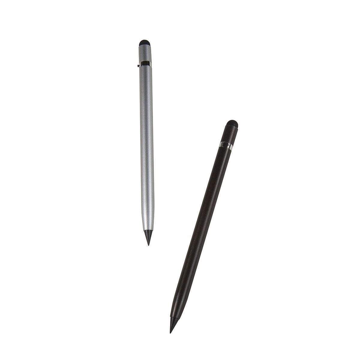 Lápiz infinito con recubrimiento metalizado y tapón de plástico. Incluye touchscreen y parte superior desprendible con borrador en su interior. – RQ 1115