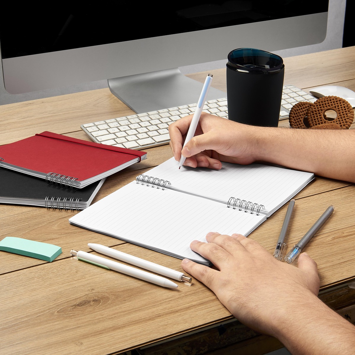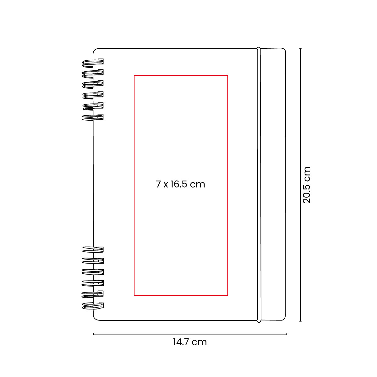 Libreta ecológica con 70 hojas a rayas. Cubierta de cartón. Incluye espiral metálico y elástico para cerrar. Su diseño divide el espiral aportando un toque distintivo de las libretas convencionales. Una elección sostenible que resaltará tu pasión por el medio ambiente. – HL 9053