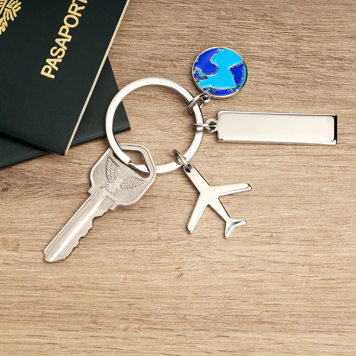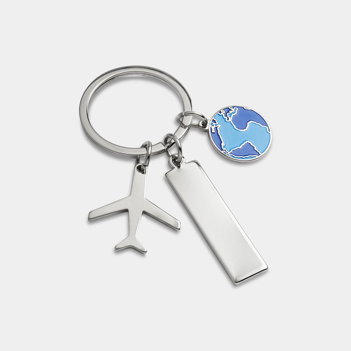 Llavero metálico con una placa para grabado, 1 dije de avión y 1 dije de mundo. Su diseño evoca el espí­ritu aventurero y la pasión por los viajes. Incluye caja individual. – M 7980
