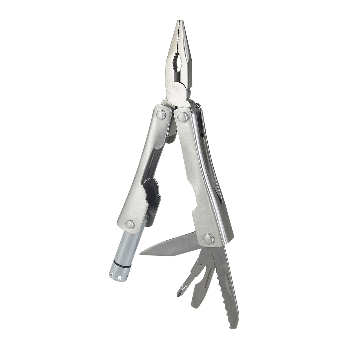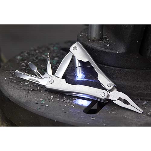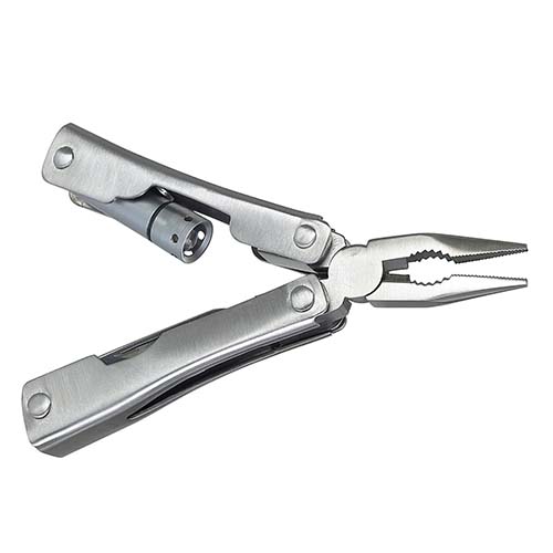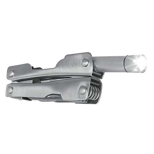 Mini pinzas con 7 funciones. Cuenta con lámpara de 1 LED, navaja, desarmador de cruz, serrucho, destapador con punta de desarmador plano. Incluye funda y 3 baterías de botón. – HER 015