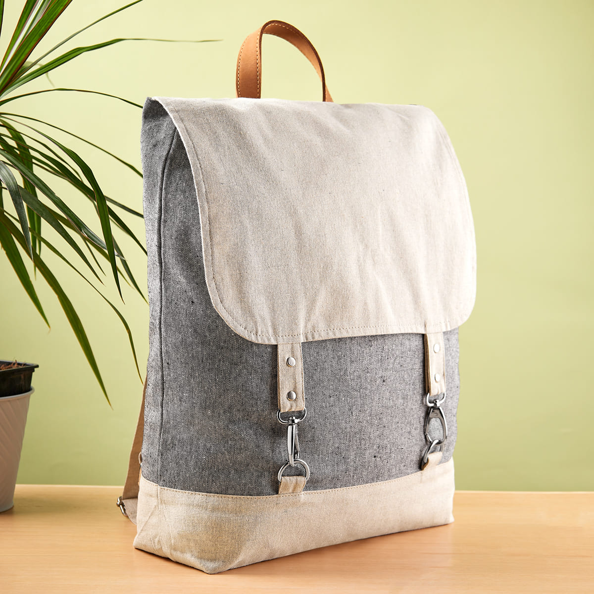 Mochila ecológica de algodón reciclado. Compartimento principal con cerrado de solapa y 2 broches metálicos. Asa superior y asas para hombro ajustables. – SIN 882