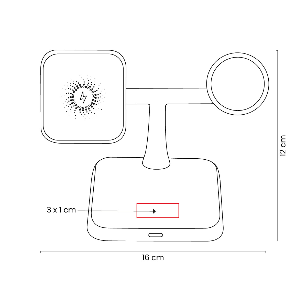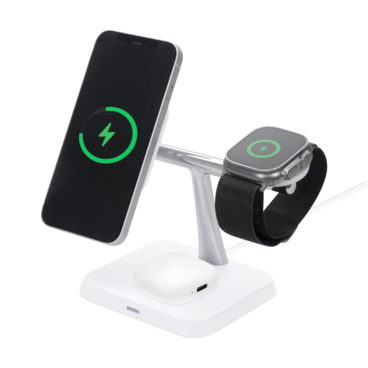 Estación de carga inalámbrica 3 en 1. Permite la carga simultanea de smartphone, earbuds y reloj inteligente. Velocidad de carga de 15 W / 5W / 3W. Incluye cable de 1m con conector tipo C y caja individual. Compatible con dispositivos que cuenten con tecnología de carga inalámbrica. – CRG 061