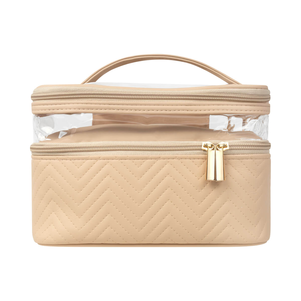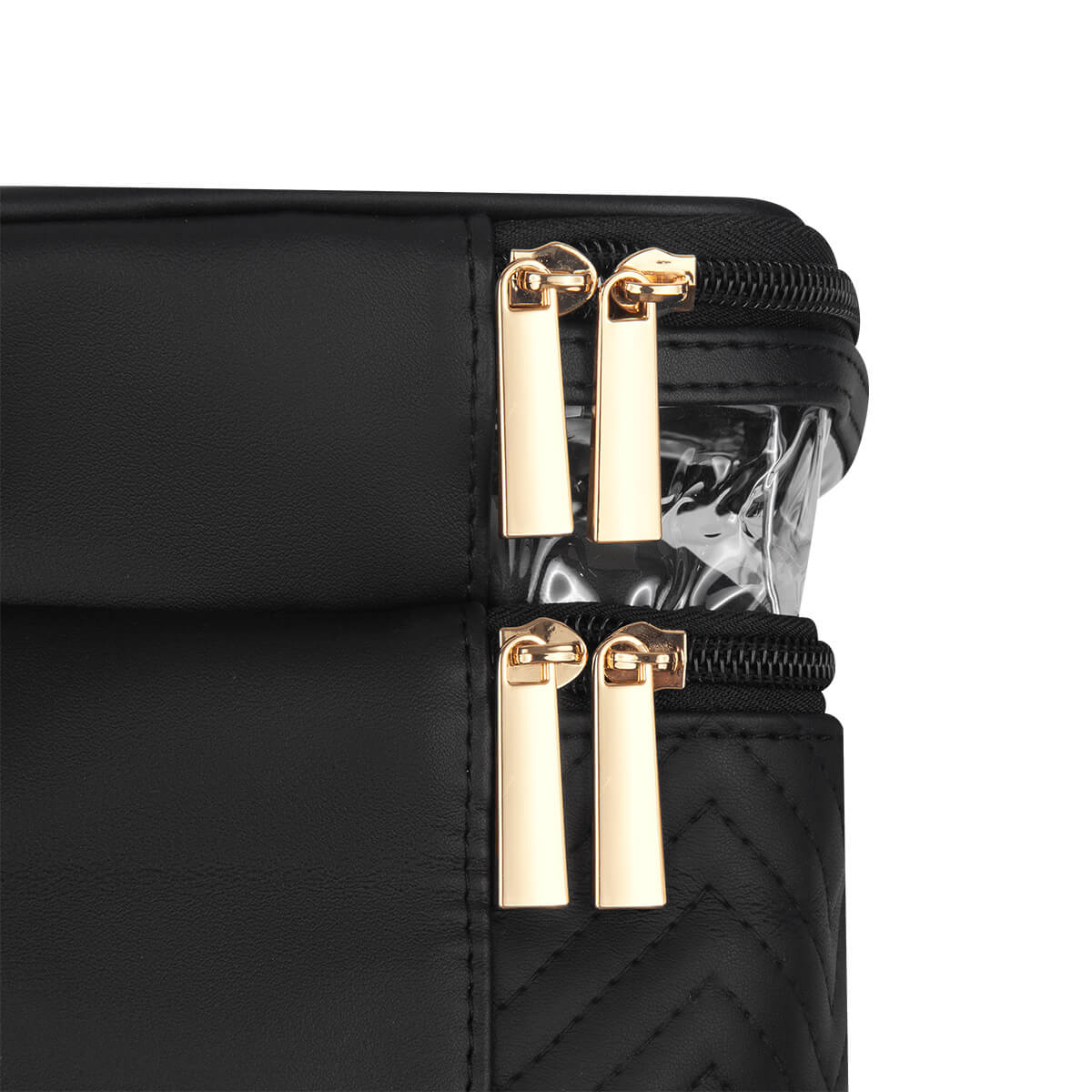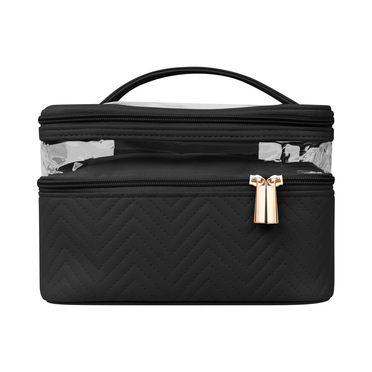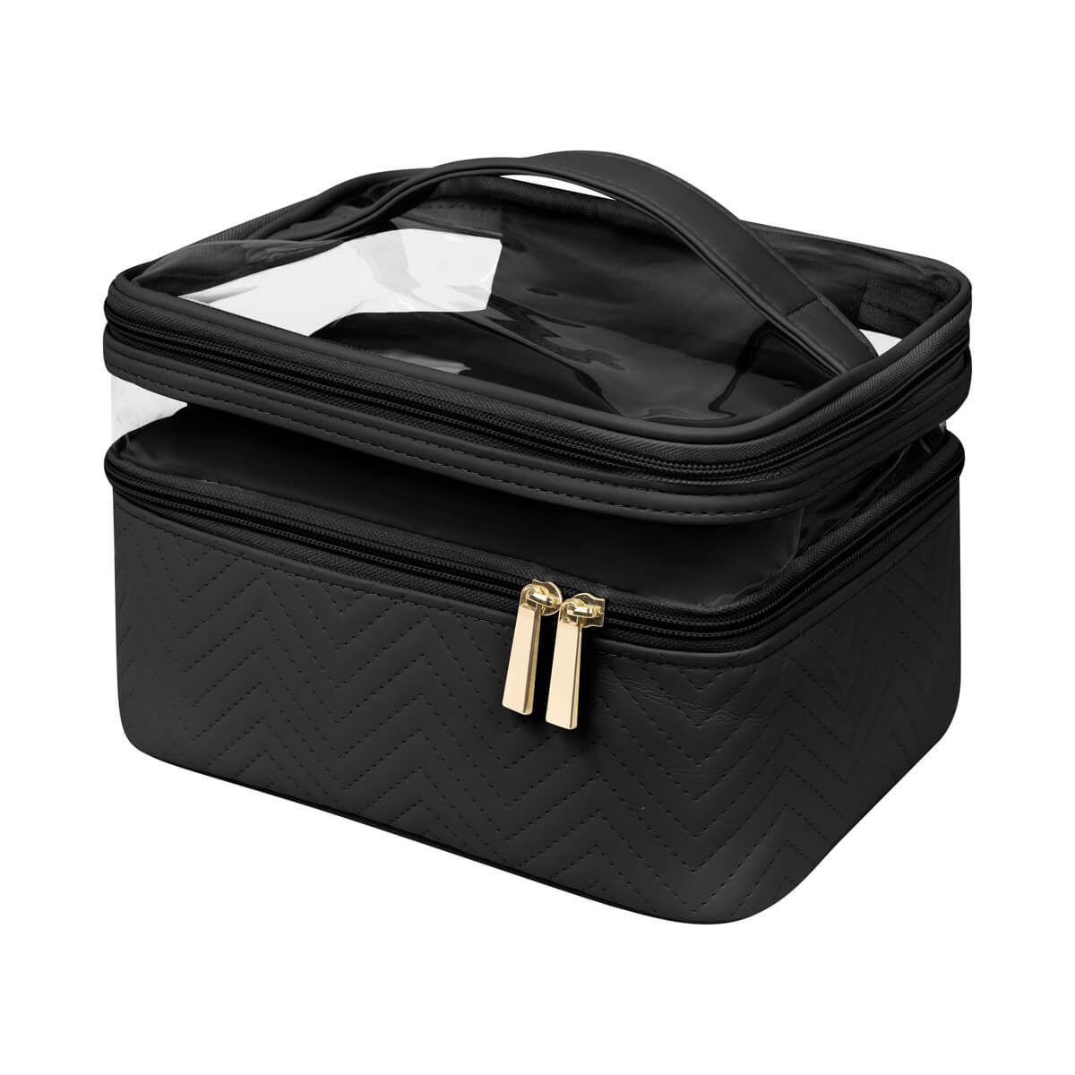 Neceser fabricado en PU con cuerpo semirrígido. Cuenta con dos niveles con cierre, ideales para organizar y separar productos de belleza o higiene personal. Su panel superior de mica transparente permite visualizar el contenido fácilmente, mientras que el asa facilita su transporte. Ideal para guardar productos de belleza, cuidado personal o maquillaje. No incluye accesorios. – DAM 075