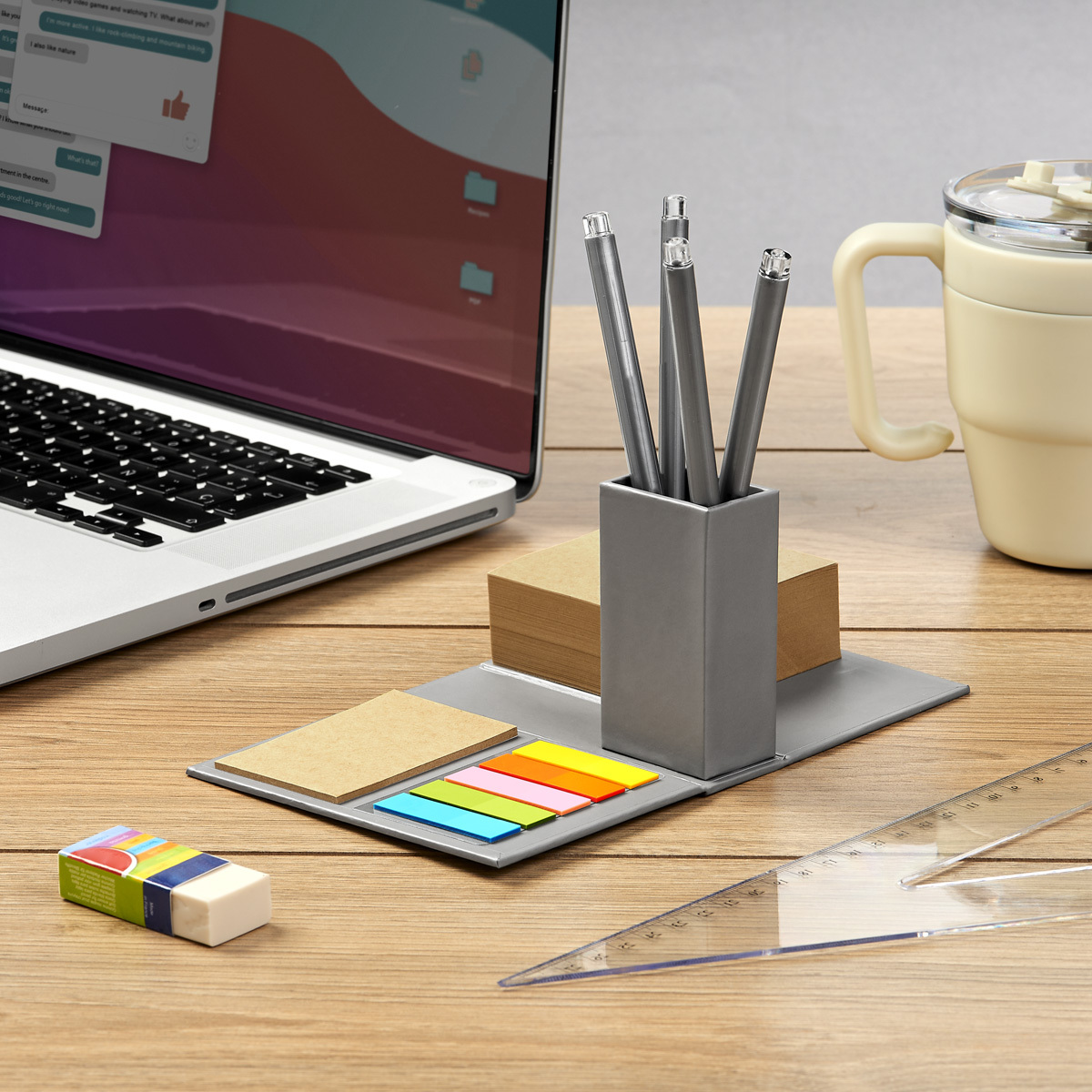 Porta notas plegable con cubierta rígida de cartón. Al desplegarlo revela un práctico porta lápices. Incluye block de 270 notas y 25 notas adhesivas de papel Kraft, 5 colores diferentes de banderines adhesivos, cada uno con 15 notas. Ideal para mantener tus notas y recordatorios organizados en un solo lugar, perfecto para oficinas y estudiantes. – HL 701