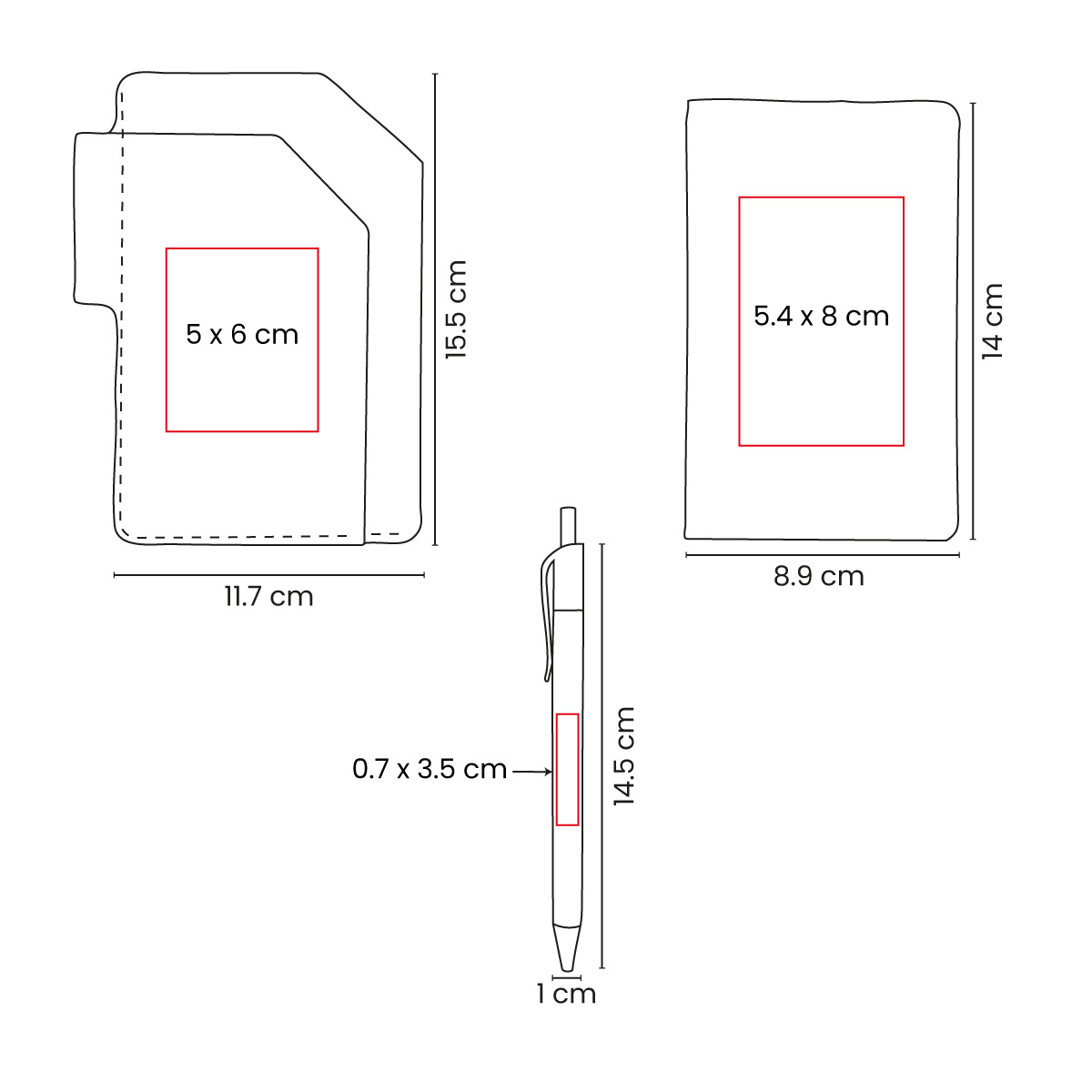 | Área de Impresión | 5 x 6 cm Porta Pasaporte / 5.4 x 8 cm Libreta / 0.7 x 3.5 cm Bolígrafo |