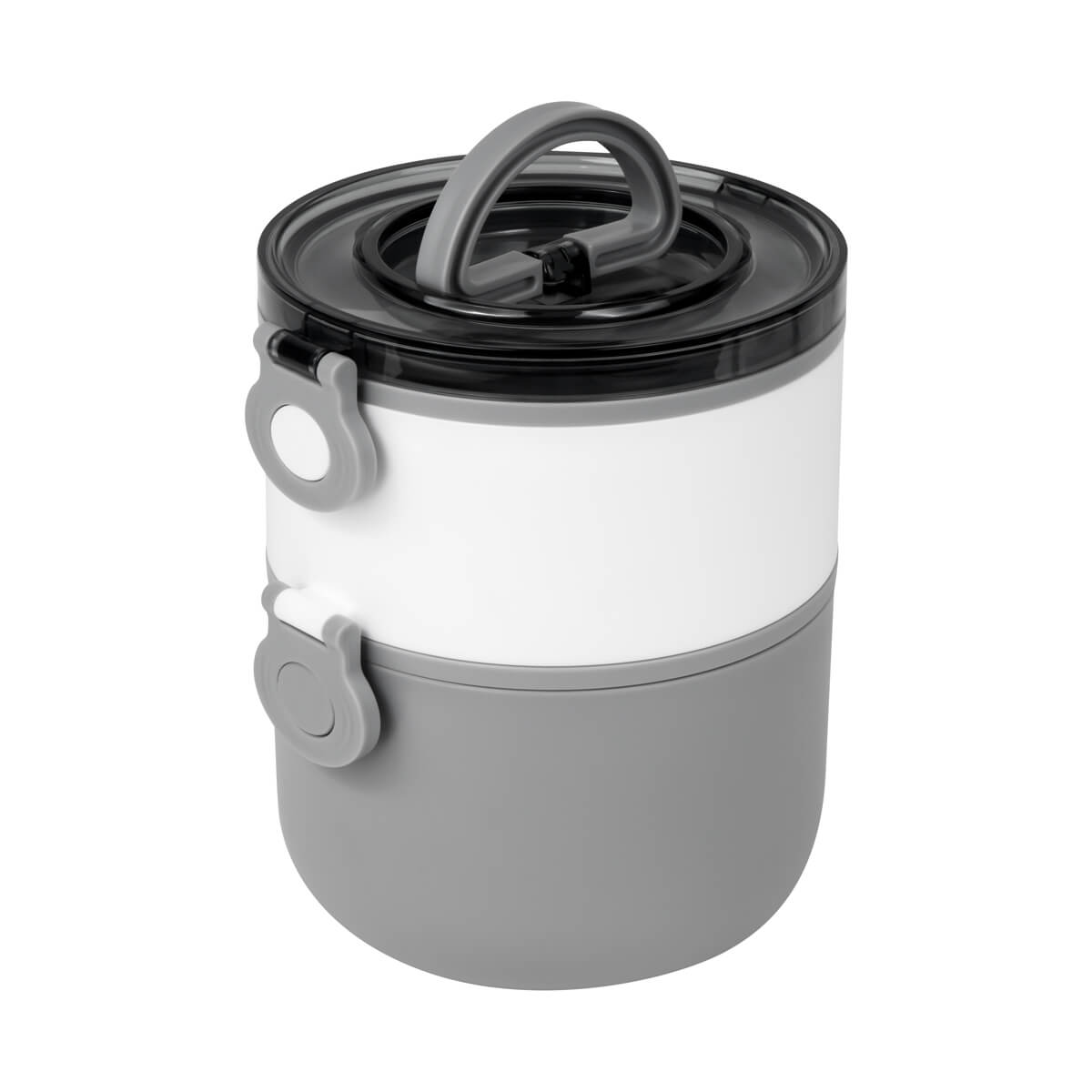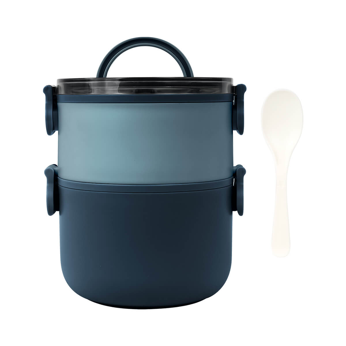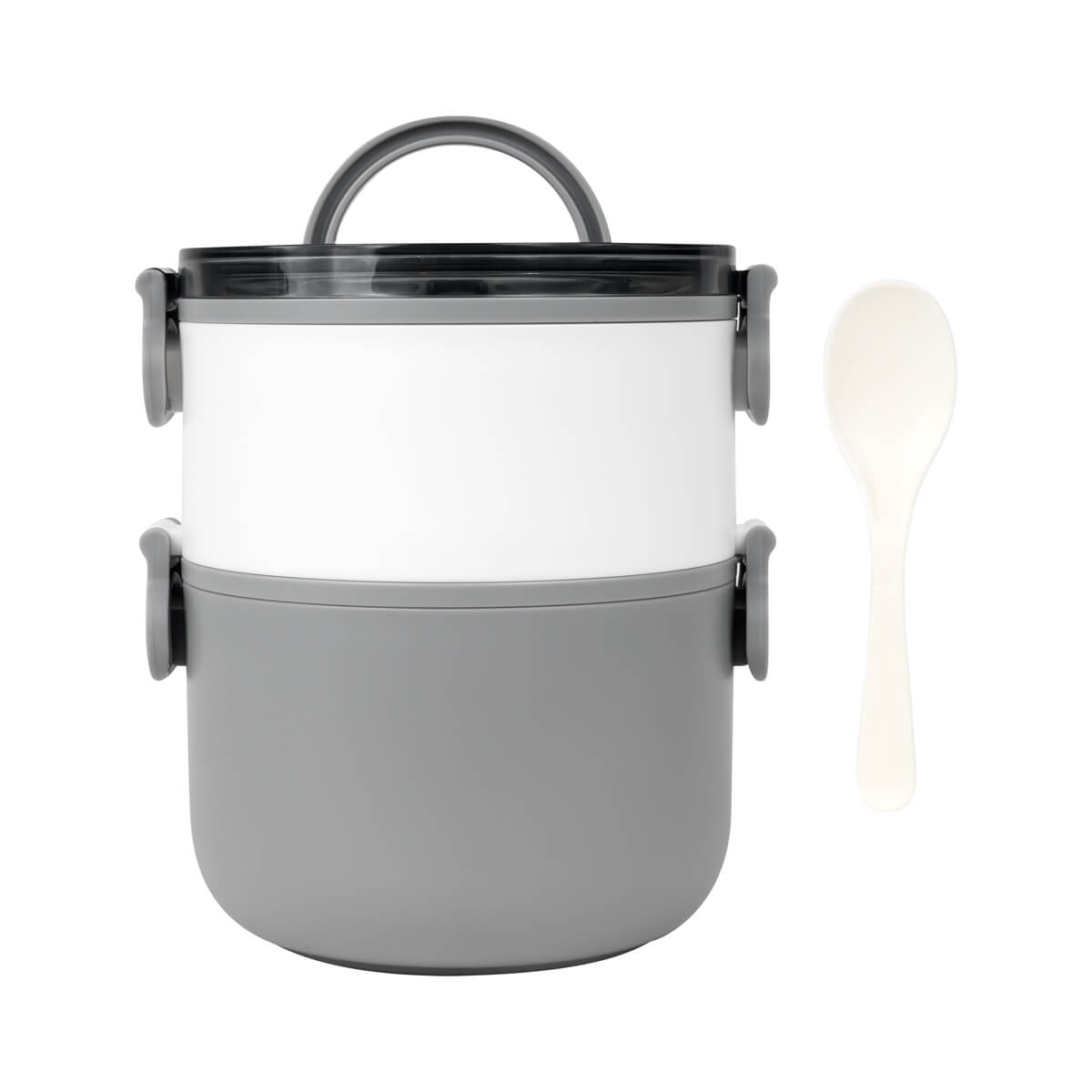 Contenedor de alimentos con dos pisos independientes que permite separar tus alimentos y no mezclar sabores. Fabricado con una pared sencilla de plástico, ideal para el uso de microondas. Cada compartimento cuenta con su tapa hermética para evitar derrames y sus broches laterales ayudan unir o separar cada elemento. Incluye cuchara de plástico, tapa con asa plegable y caja individual. Apto para el uso en microondas y lavavajillas. – KTC 605