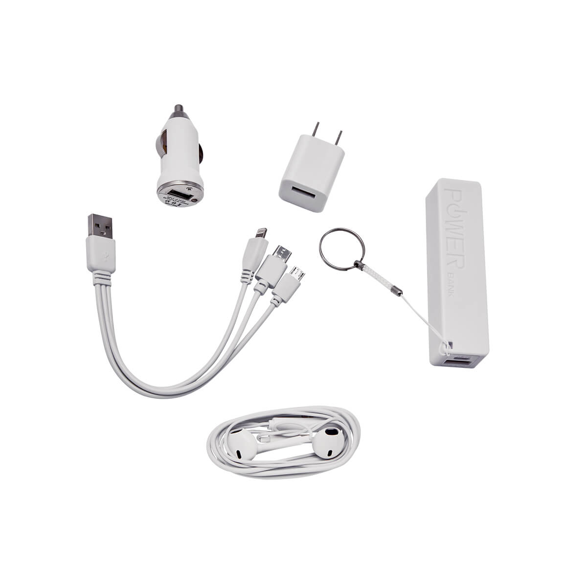 Incluye batería auxiliar de 2,600 mAh, cargador para automóvil, cargador de pared, audífonos, cable cargador USB 3-en-1 (micro USB, tipo C y lightning) y estuche. – SET 055