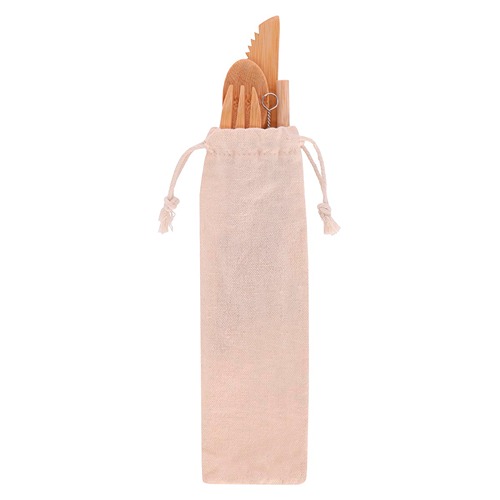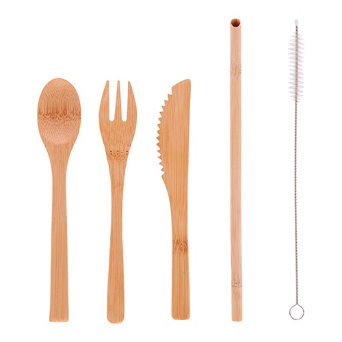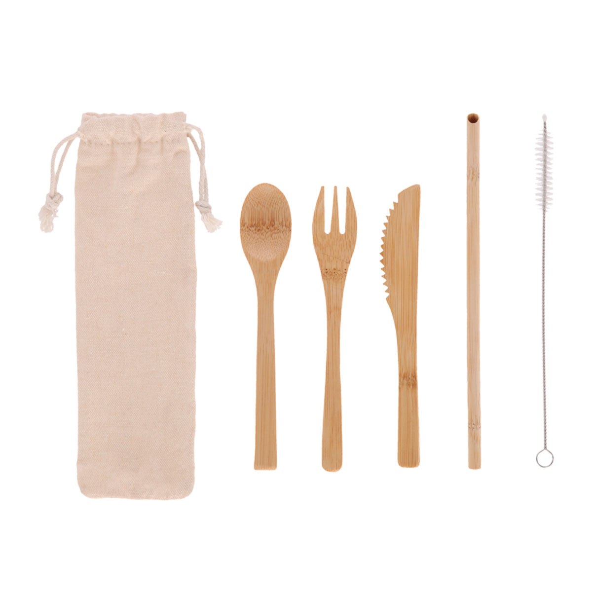 Set de cubiertos de bambú. Incluye tenedor, cuchara, cuchillo, popote, cepillo limpiador y bolsa con jareta. – KTC 046