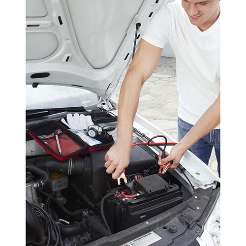 Contiene cables pasa corriente (100 amp), medidor de presión de aire (50 psi), guantes, impermeable, vendas adheribles para proteger heridas, pinza, estuche y lámpara para cabeza con 7 LEDS, utiliza 3 baterías AAA (no incluidas). – HER 020-