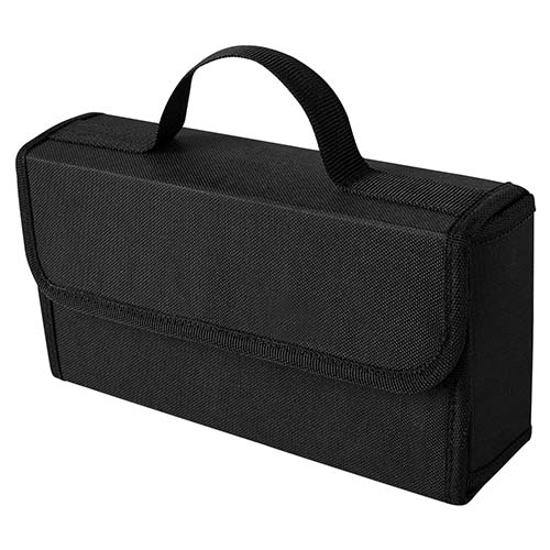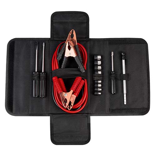 Contiene cables pasa corriente (100 amp), 9 dados, medidor de presión de aire, desarmador punta de cruz, desarmador punta plana, desarmador para dados. Incluye estuche de tela. – HER 047
