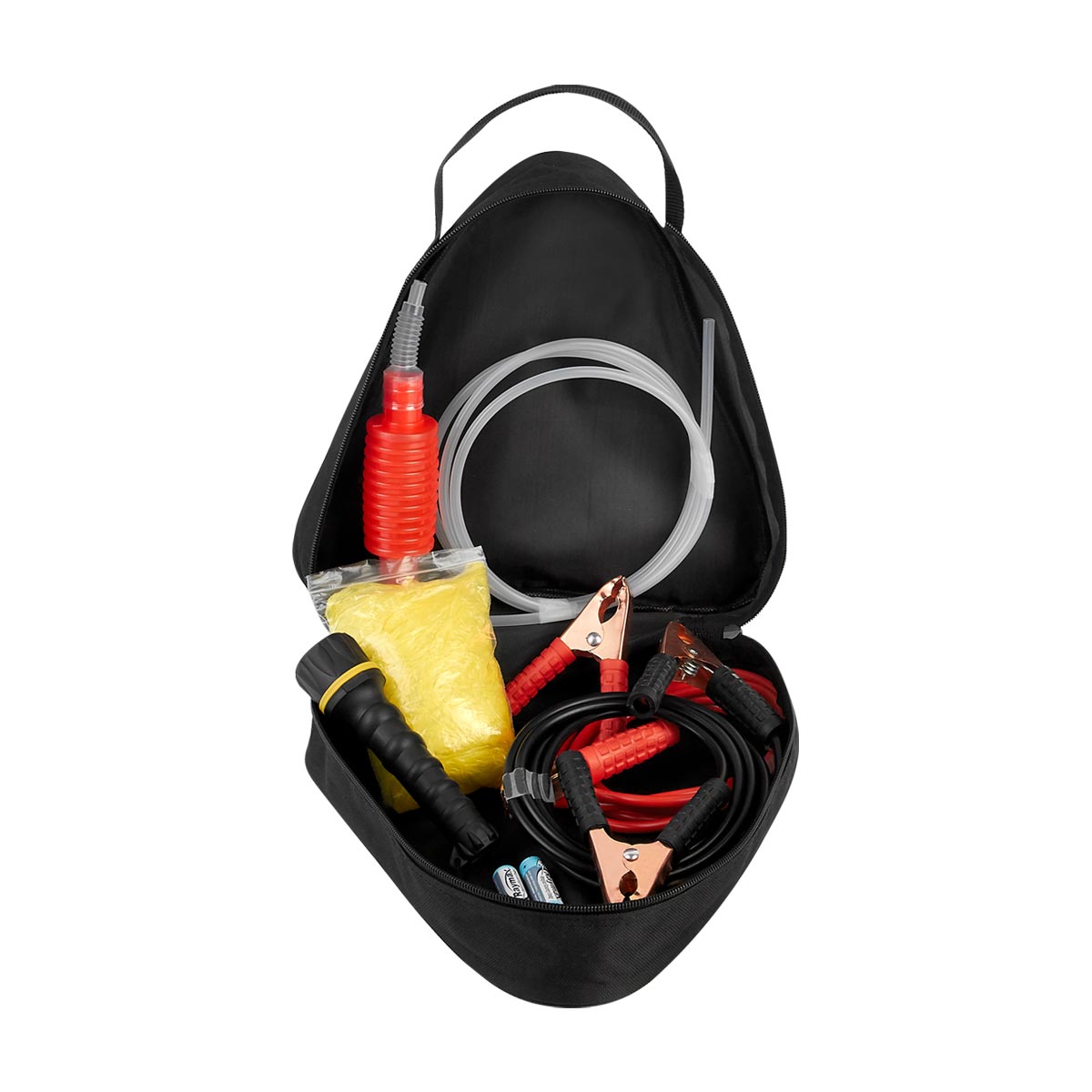Contiene cables pasa corriente, bomba manual para gasolina, linterna con 2 baterías AA (incluidas), poncho de plástico y funda con triángulo reflejante. – HER 054