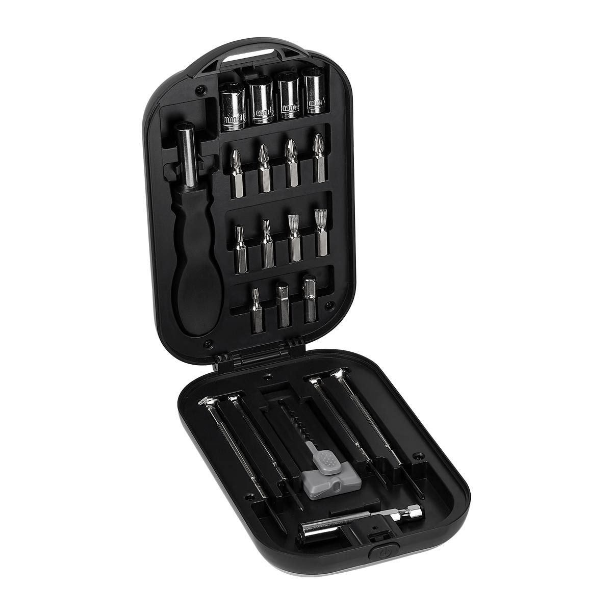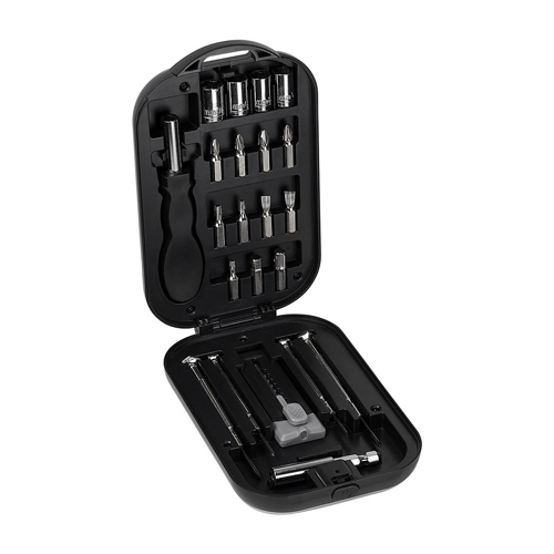 Contiene cúter, 4 desarmadores de relojero, dado extensión, 4 dados, desarmador con 10 puntas diferentes e intercambiables. Incluye estuche. – HER 056