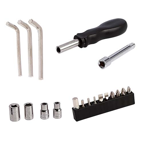 Contiene desarmador con 10 puntas diferentes e intercambiables, 3 llaves hexagonales, dado extensión y 4 dados. Incluye estuche de tela. – HER 010-