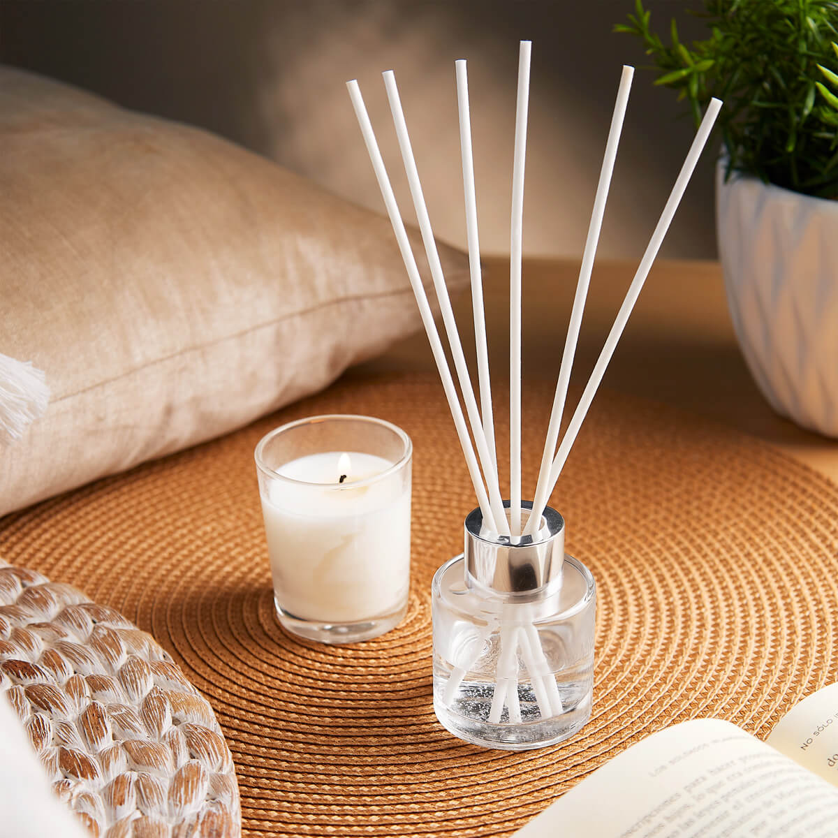 Crea un ambiente de serenidad y bienestar en tu hogar este set de vela y esencia. Incluye una vela aromatizante que llena cualquier espacio con una fragancia envolvente, y una esencia ambiental con 6 varillas que dispersan un aroma sutil y duradero a lo largo del día. Ambos con aroma a vainilla. Incluye caja de regalo ecológica. – KTC 950