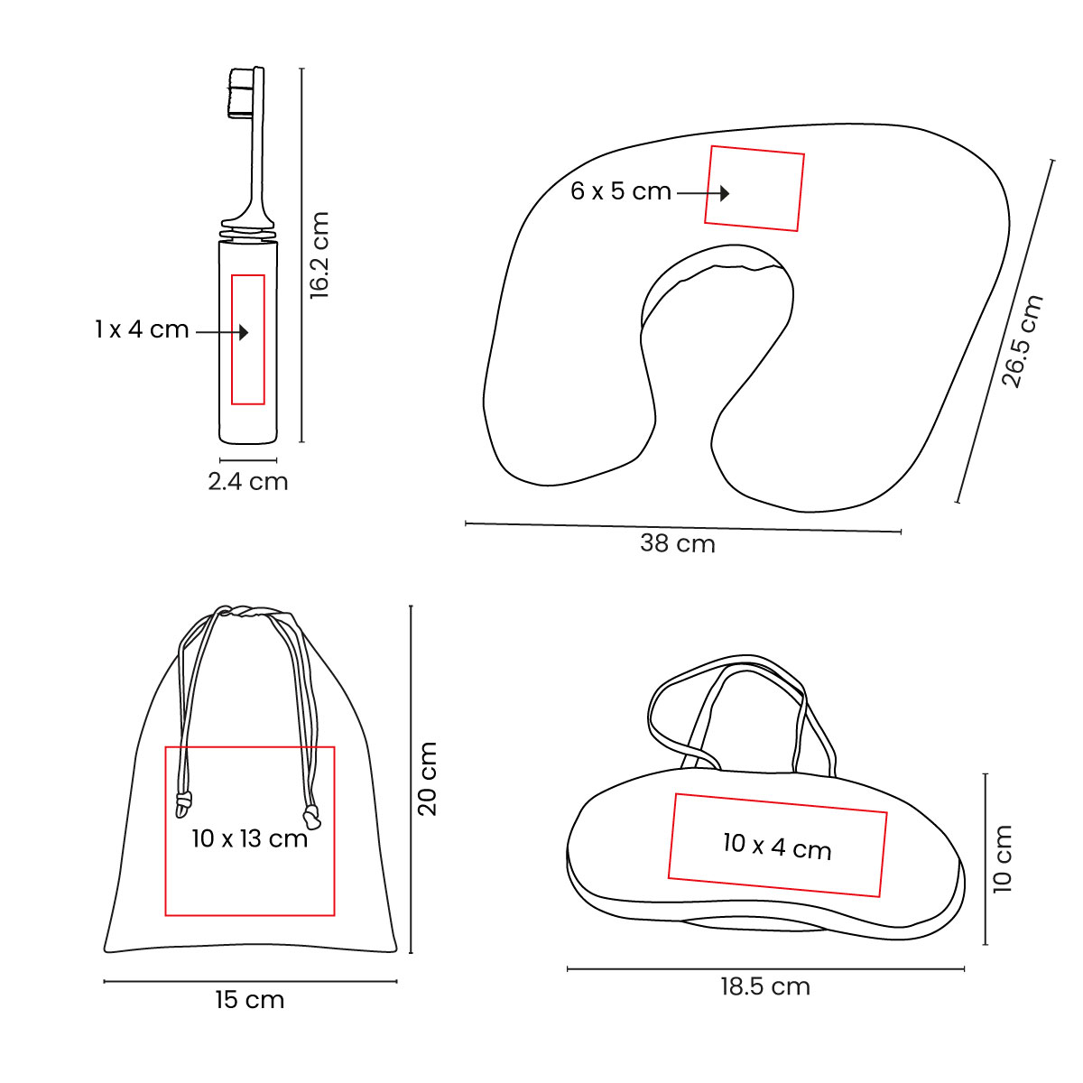 | Área de Impresión | 10 x 13 cm Bolsa / 10 x 4 cm Antifaz / 6 x 5 cm Almohada / 1 x 4 cm Cepillo Dental |