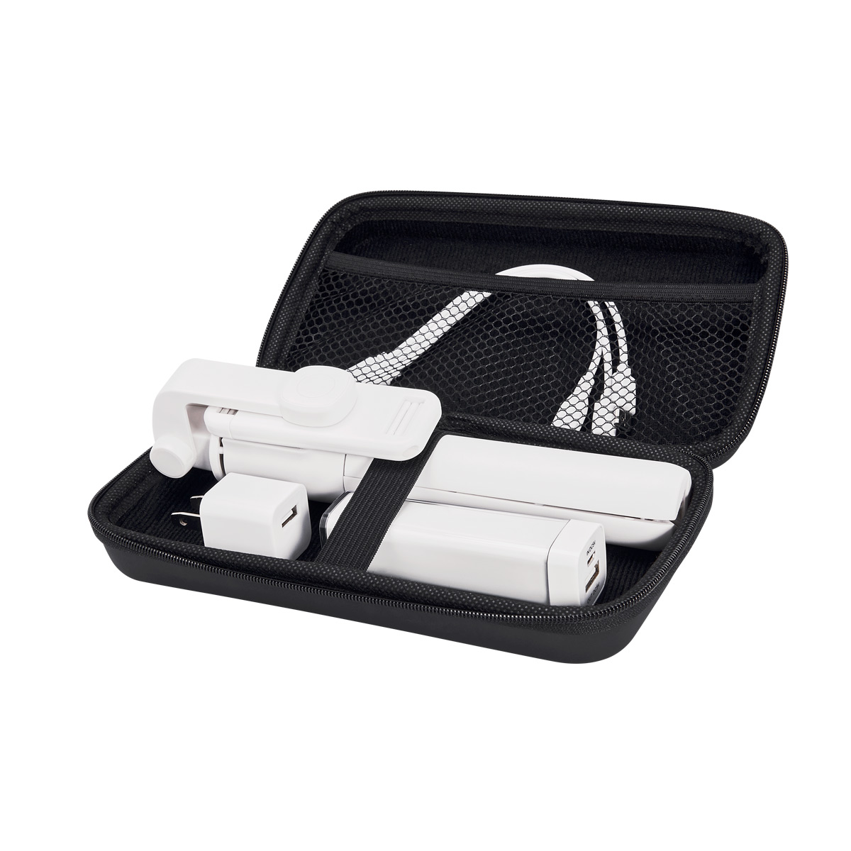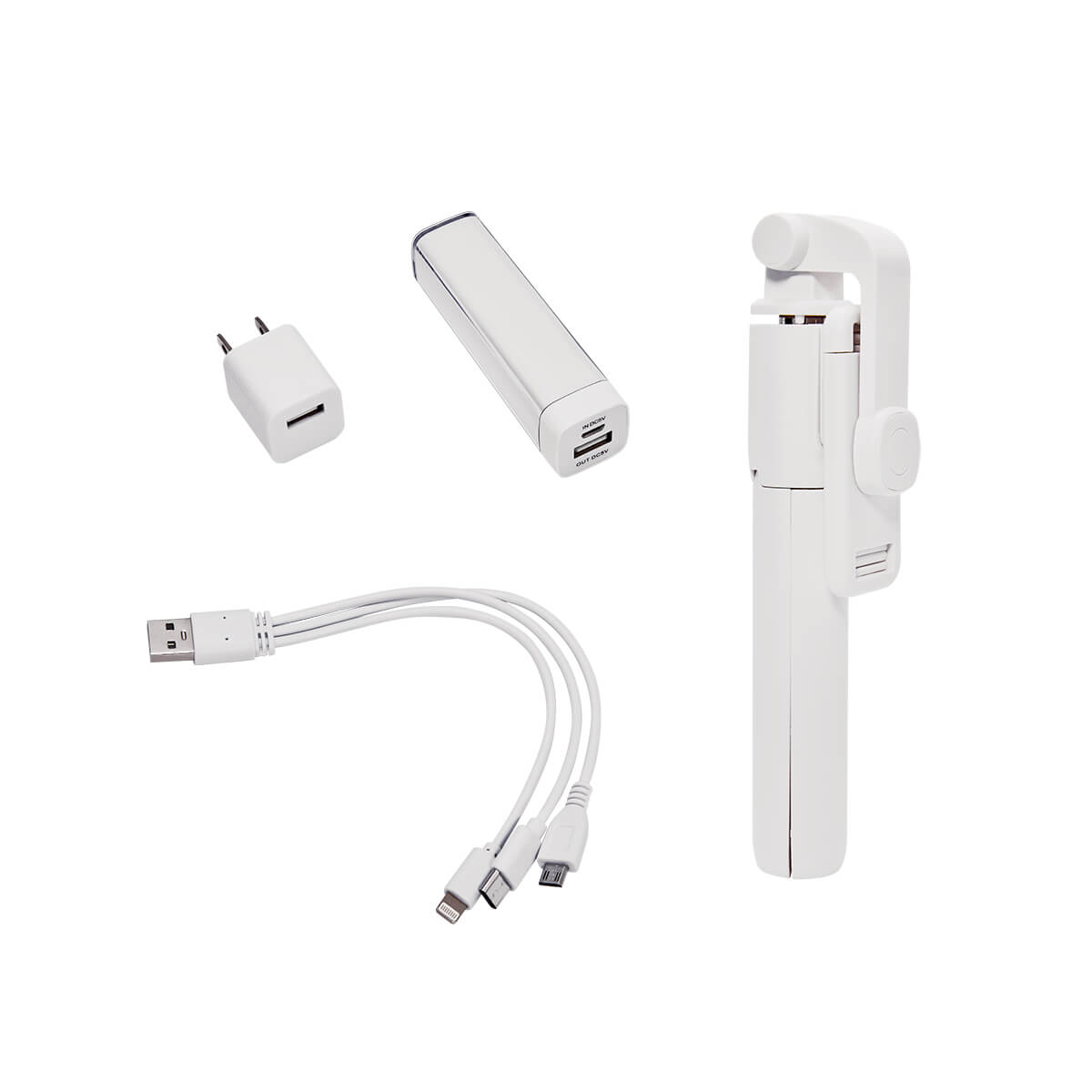 Incluye selfie stick inalámbrico con bluetooth y control remoto para accionar la cámara a distancia. Batería auxiliar de 2,200 mAh, cargador de pared, cable cargador USB 3 en 1 (micro USB, tipo C y lightning) y estuche. – SET 066