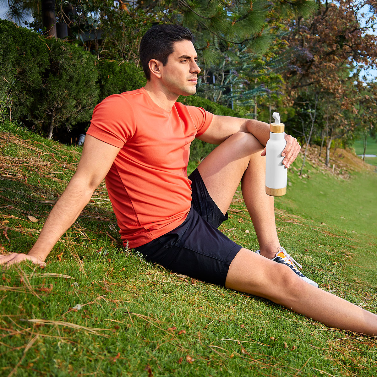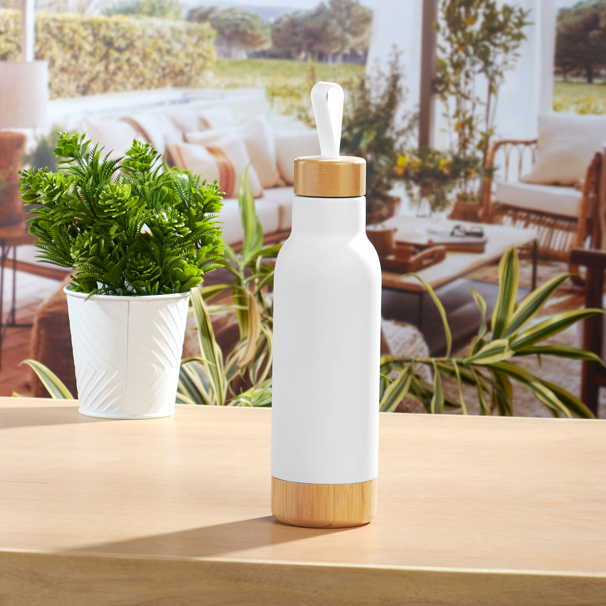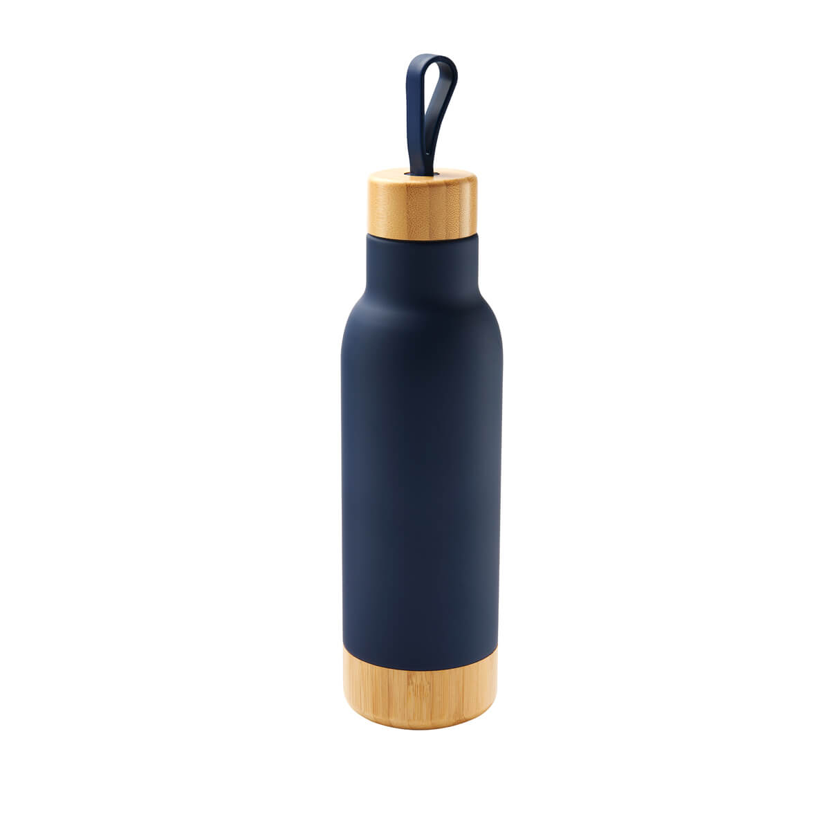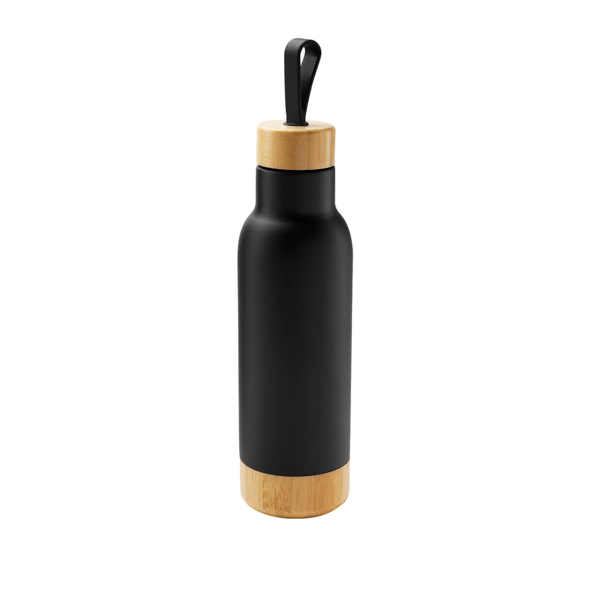 Doble pared. Cerrado al vacío. Pared interna y externa de acero inoxidable. Tapa de bambú con sistema de rosca, asa de silicón y base de bambú. Mantiene temperatura caliente 6 hrs y temperatura fría 12 hrs. Incluye caja individual.