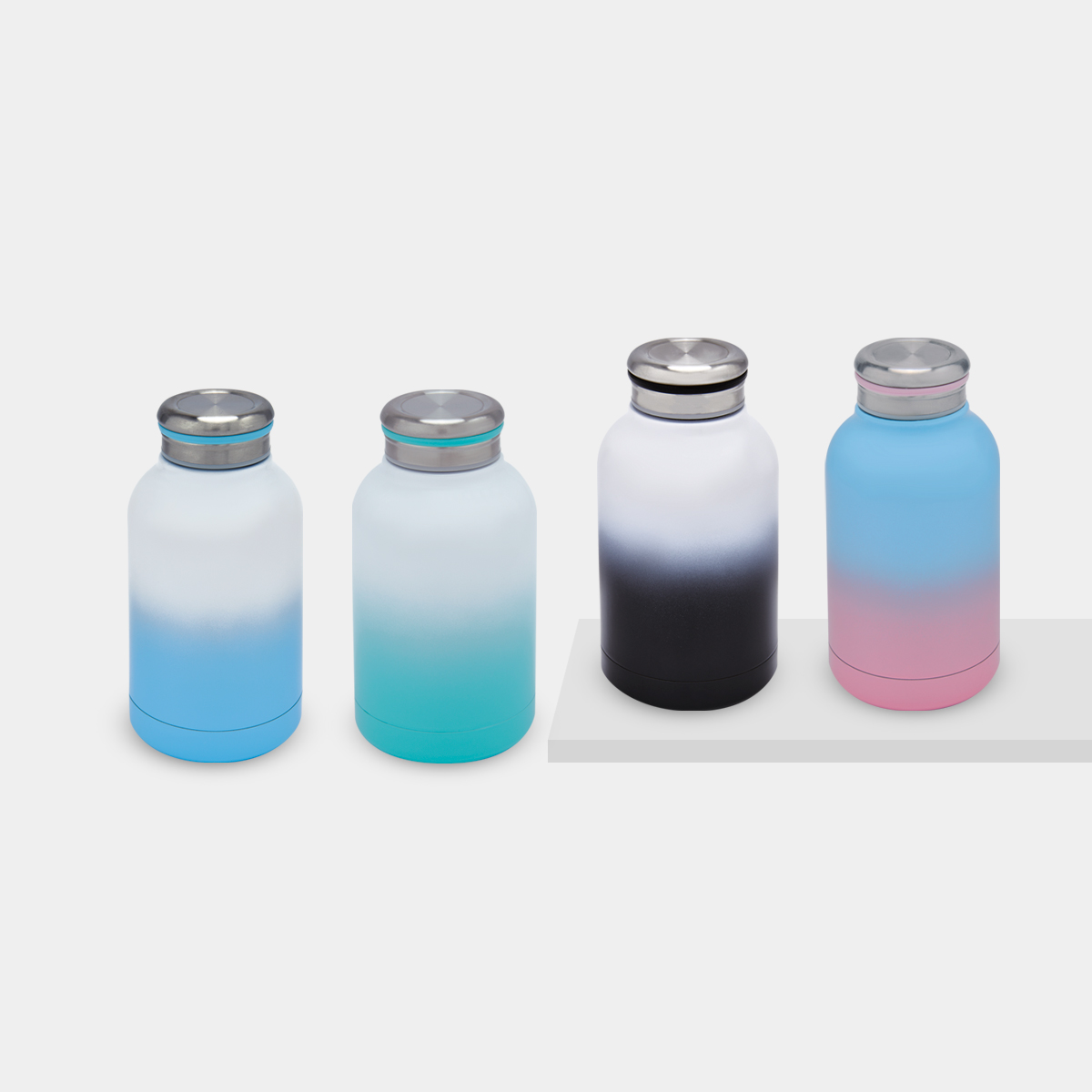 Mini termo color degradado. Doble pared. Cerrado al vacío. Pared interna y externa de acero inoxidable. Mantiene temperatura caliente 6 hrs y temperatura fría 8 hrs aproximadamente. Tapa con sistema de rosca. El termo es pintado a mano, por lo que el color y degradado pueden variar. Incluye caja individual. – TMPS 137