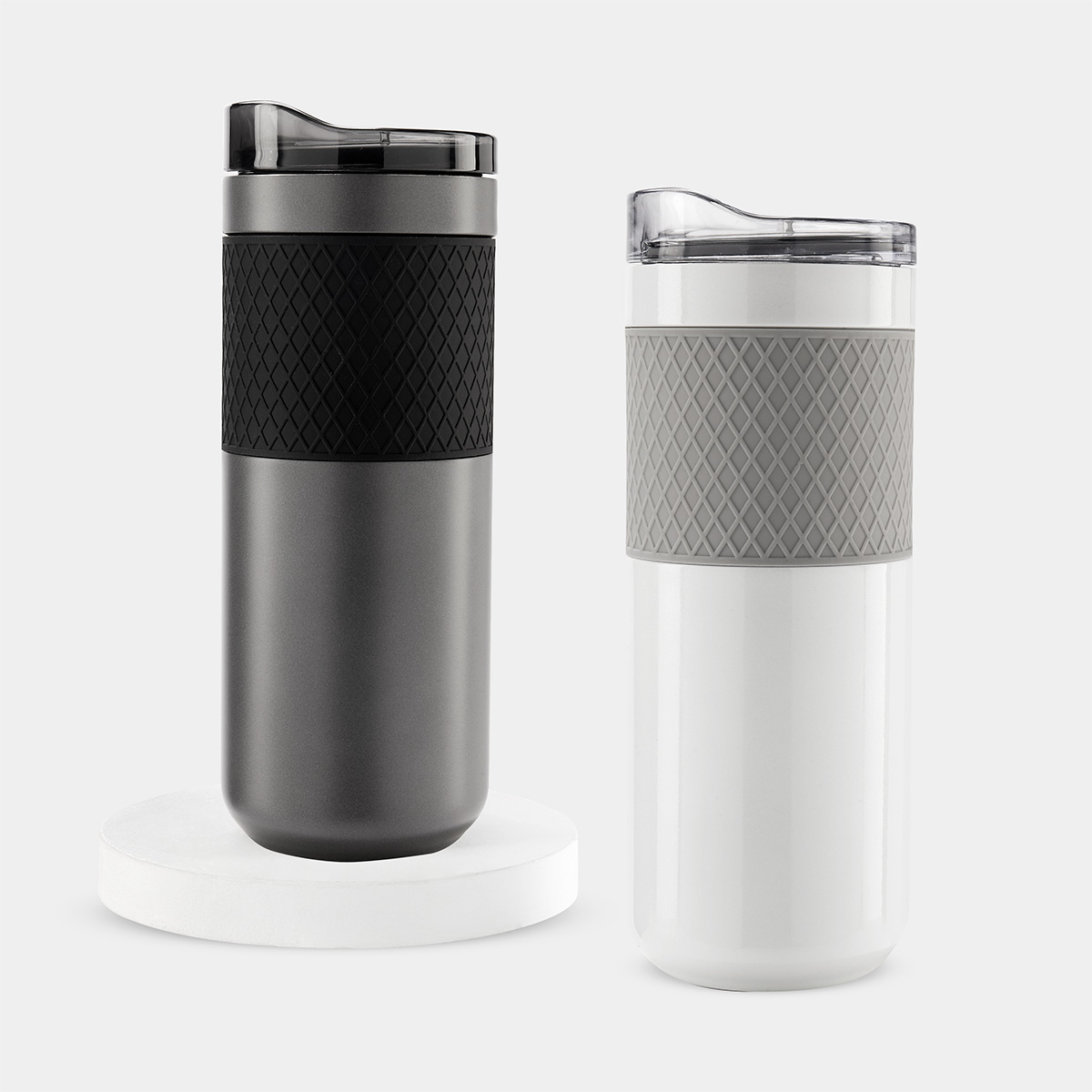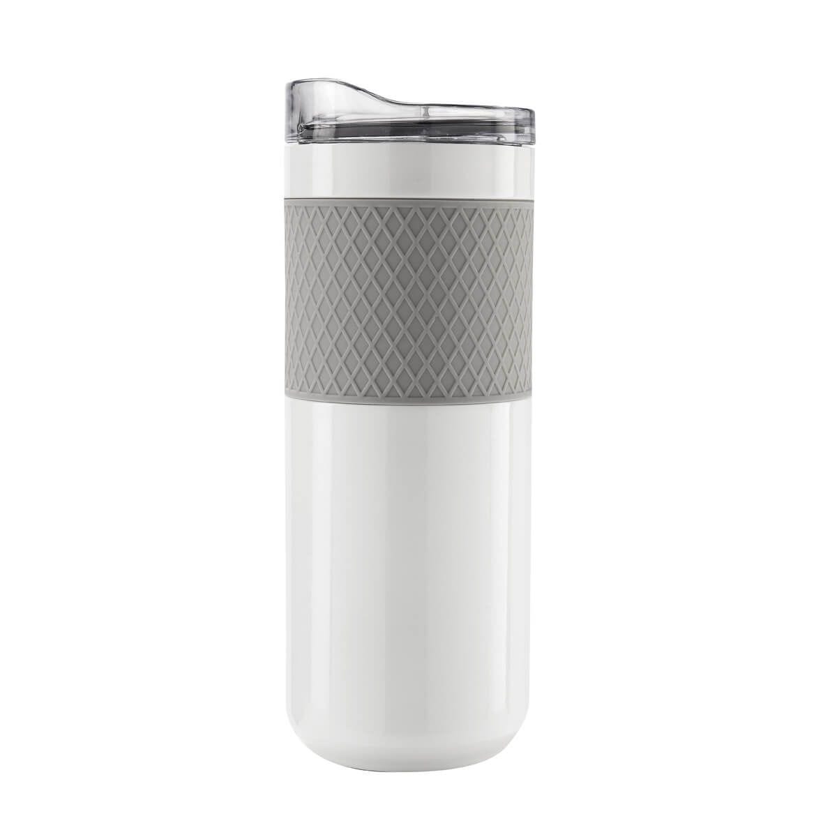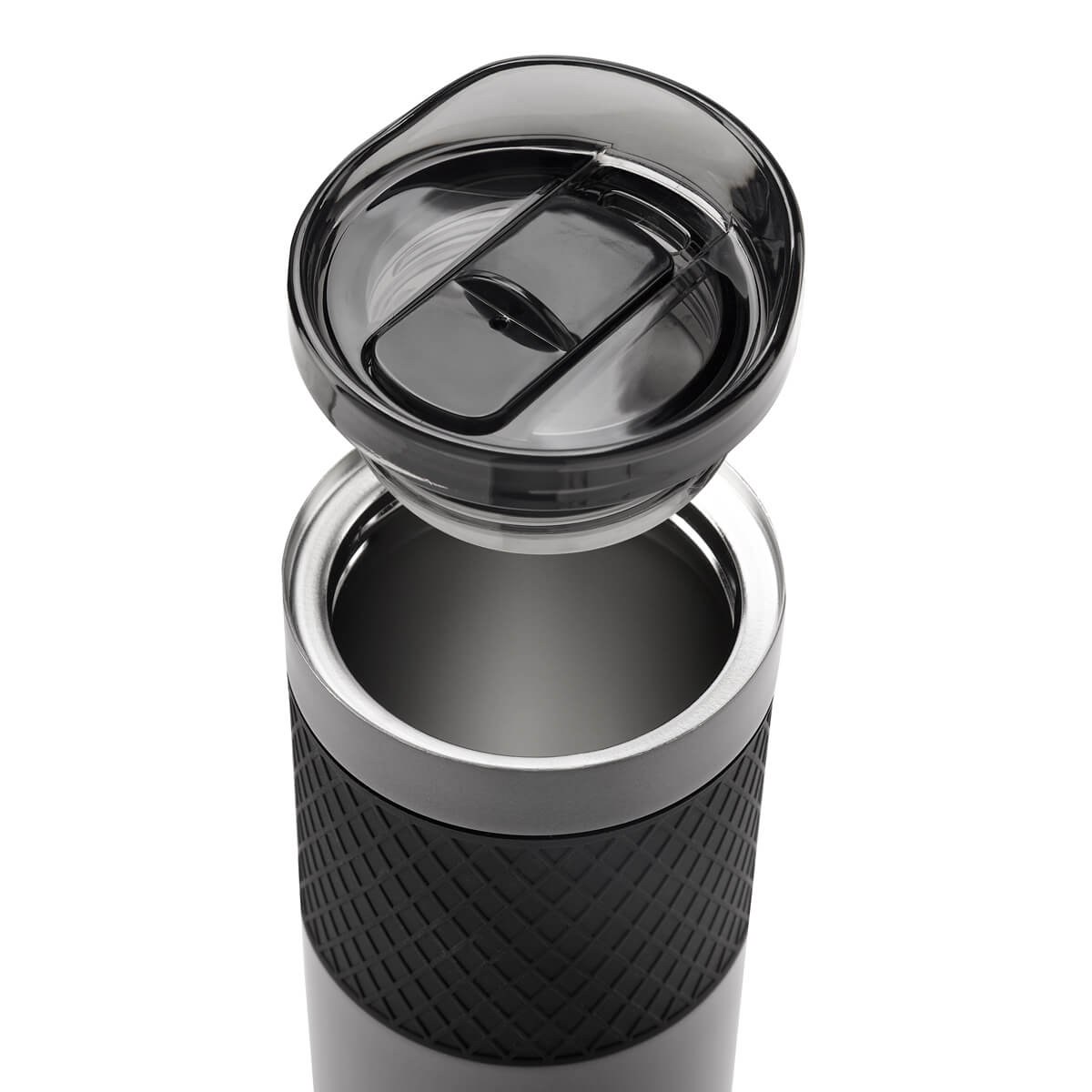 Doble pared. Cerrado al vacío. Pared interna y externa de acero inoxidable. Incluye tapa de plástico con cierre de rosca y válvula de seguridad. Banda de silicón texturizada antiderrapante. Mantiene temperatura caliente 6 hrs y temperatura fría 8 hrs.Incluye caja individual. – TMPS 186