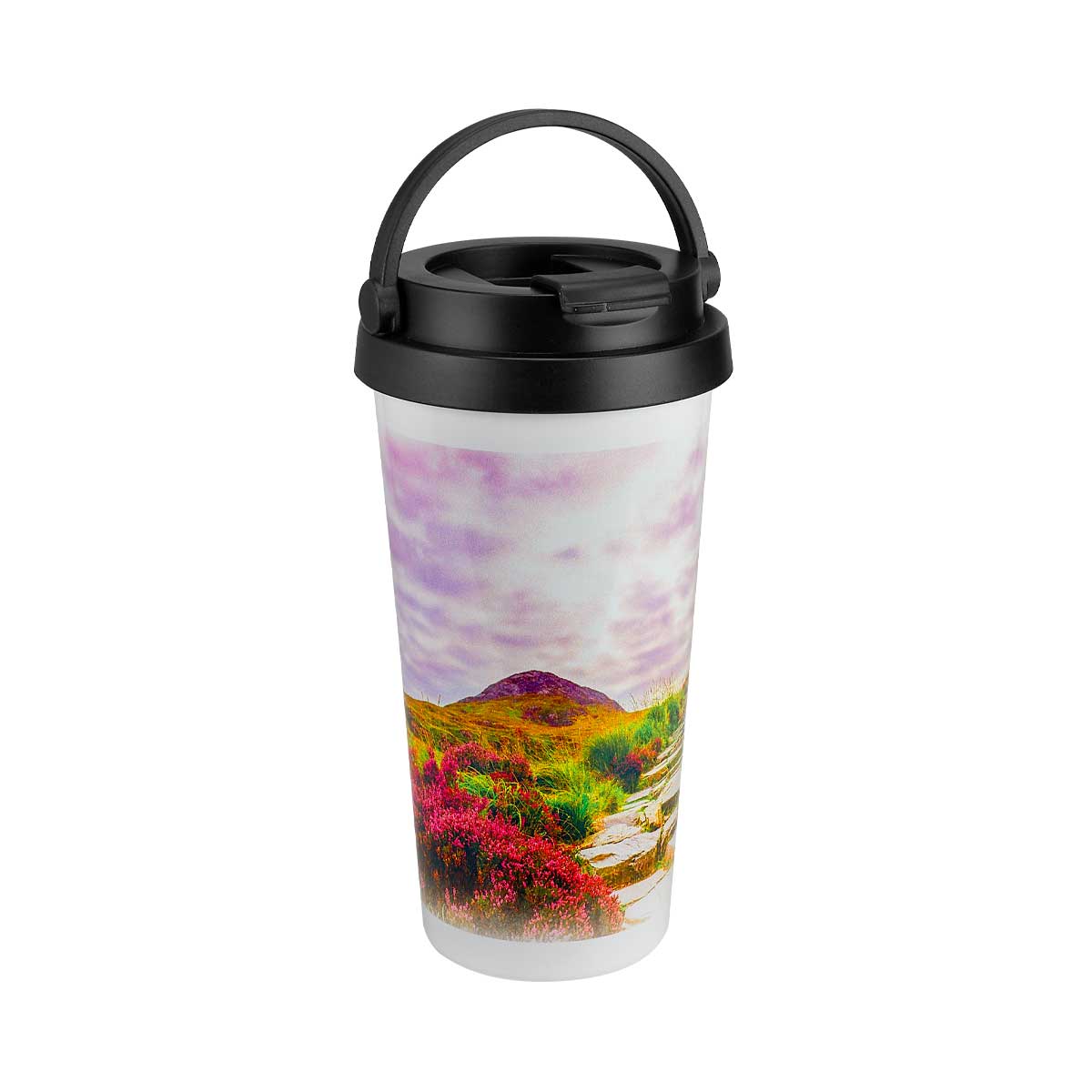 Termo para sublimar doble pared. Cerrado al vacío. Pared interna y externa de acero inoxidable. Tapa de plástico con válvula de seguridad y asa plegable. Mantiene temperatura caliente 6 hrs y temperatura fría 8 hrs aproximadamente. Incluye caja individual. – TMPS 210