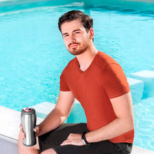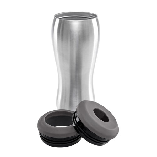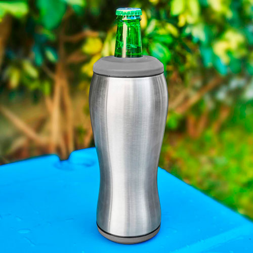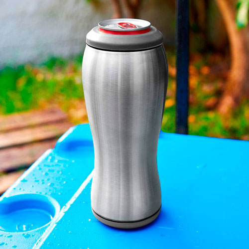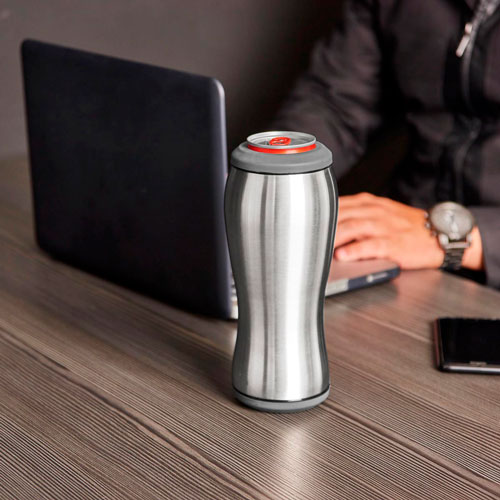Doble pared. Pared interna y externa acero inoxidable. Tapas intercambiables para lata o botella. Mantiene la bebida fría. Incluye caja individual. – TMPS 81