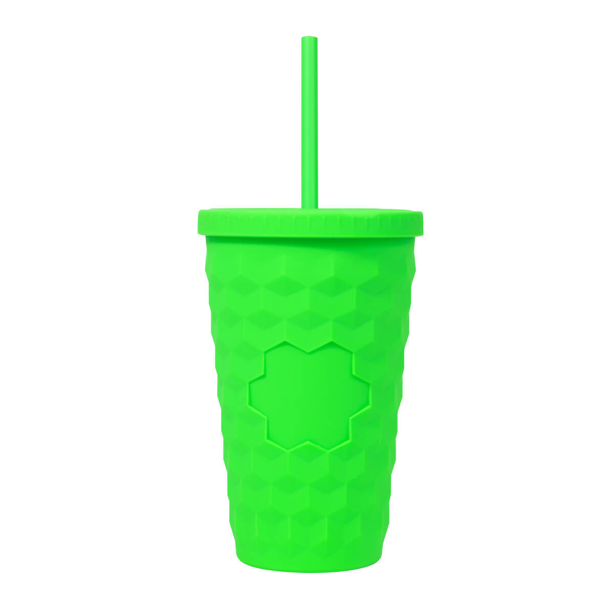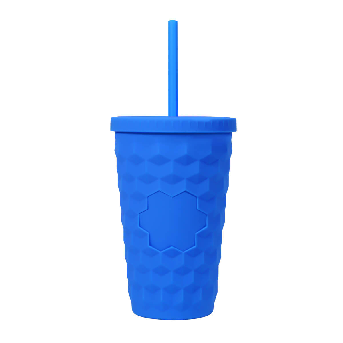 Vaso doble pared. Pared interna y externa de plástico. Tapa de plástico con sistema de rosca. Incluye popote. Cuerpo con terminado rubber que lo hace suave al tacto. Su diseño en relieve le da un toque único y diferente, además permite un mejor agarre al llevar tus bebidas favoritas. Capacidad 16 Oz. Base de 6.7 cm de diámetro. Caja individual incluida. – TMPS 254