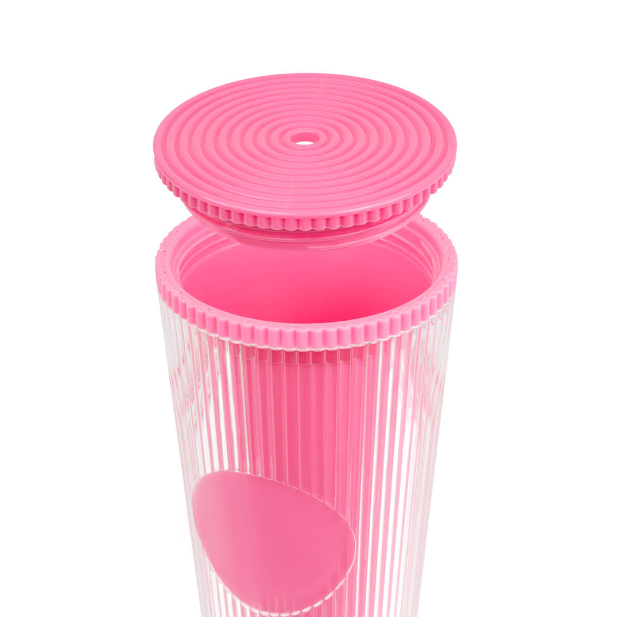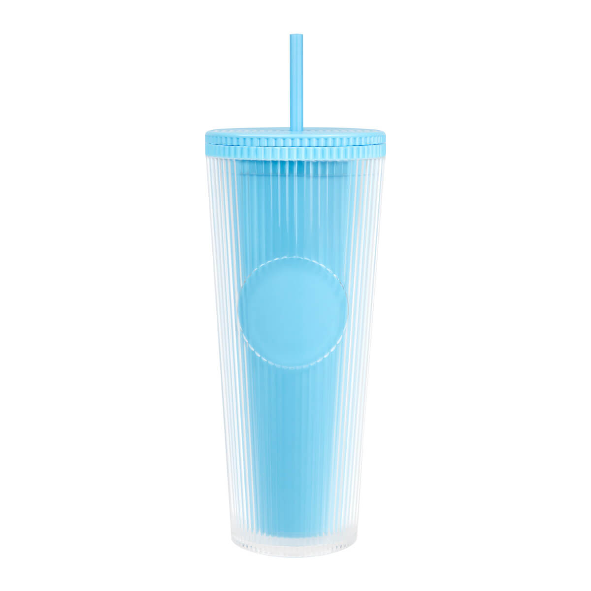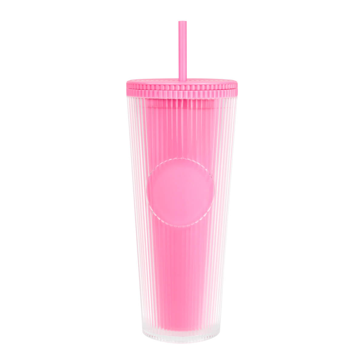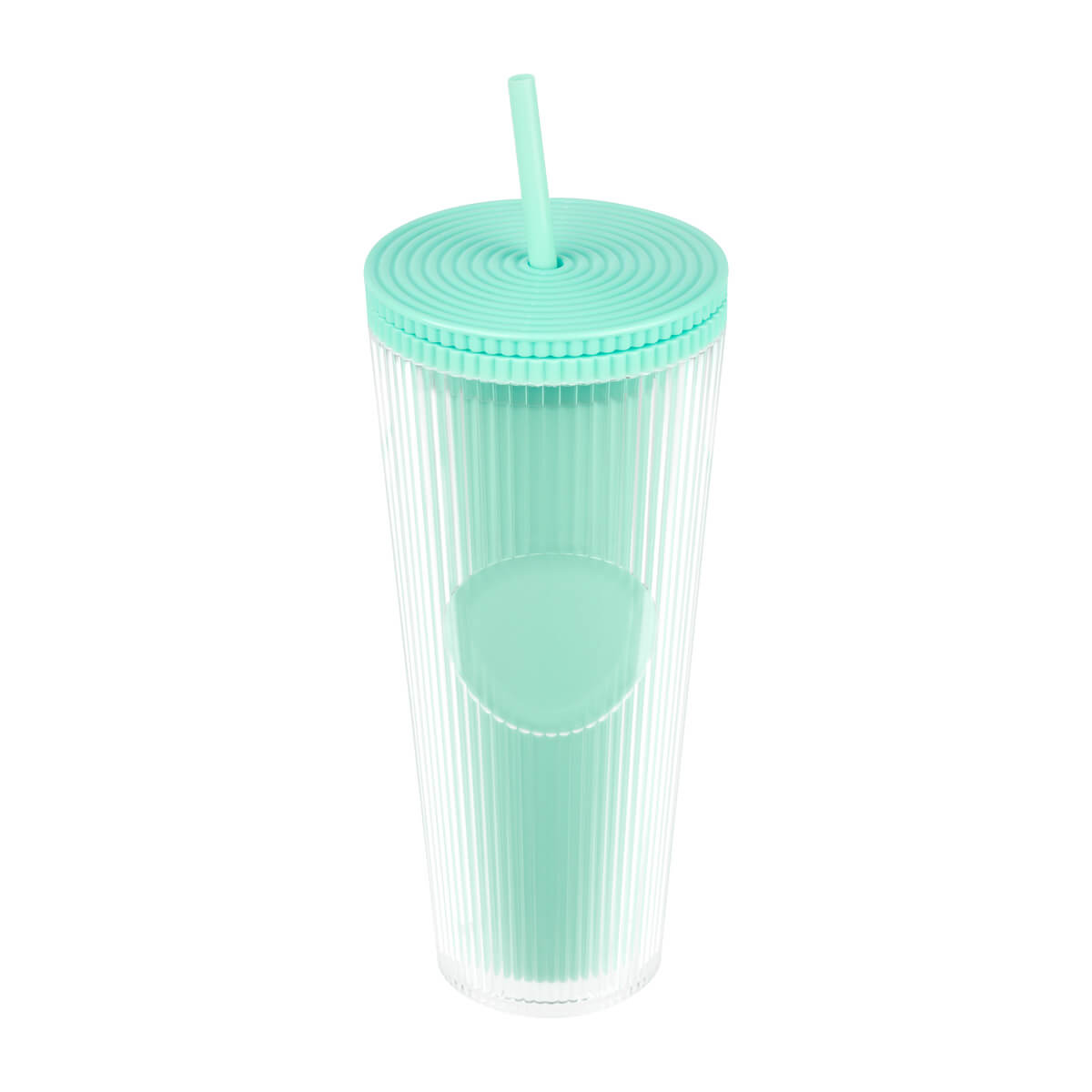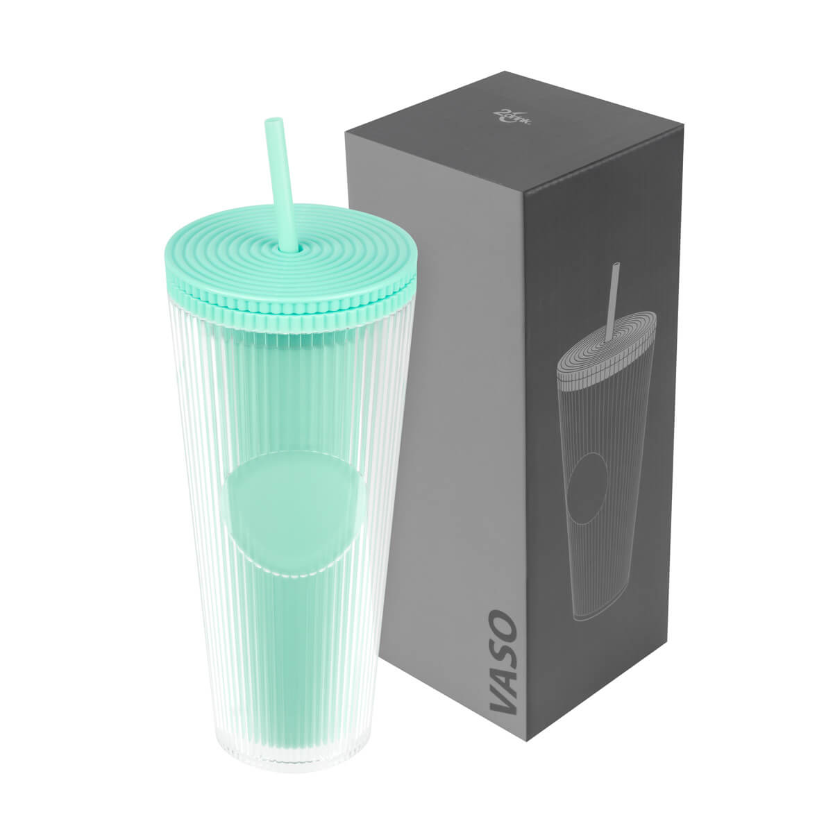 Vaso doble pared. Pared interna y externa de plástico. Tapa de rosca y ranura para popote. Diseñado moderno de acabado texturizado, con líneas en relieve le dan un toque único y moderno. Ideal para oficina, escuela o para disfrutar de tus bebidas mientras viajas. Capacidad de 24 Oz. Base de 7 cm de diámetro. Incluye popote de plástico y caja individual. – TMPS 246